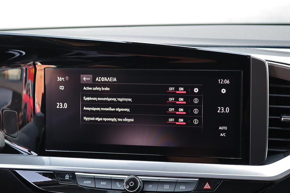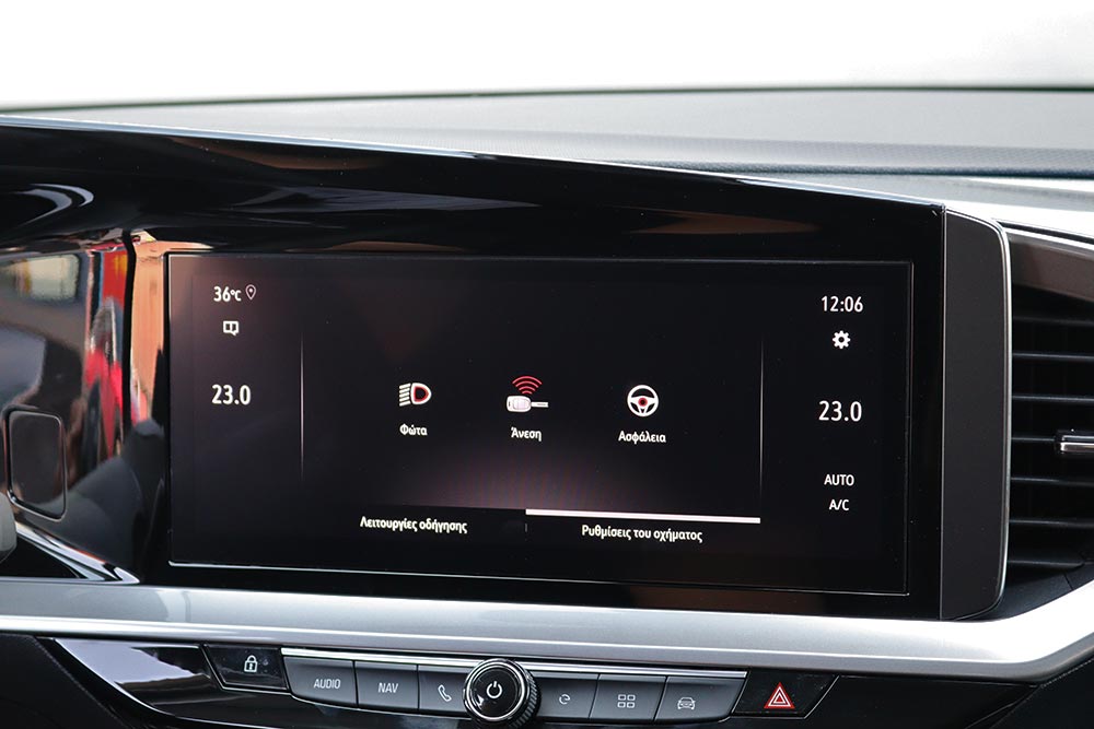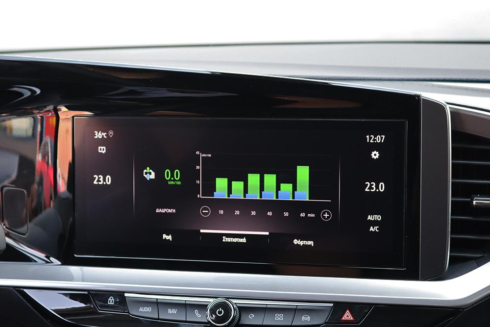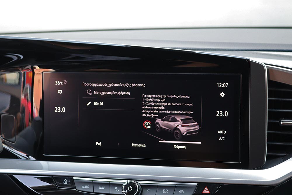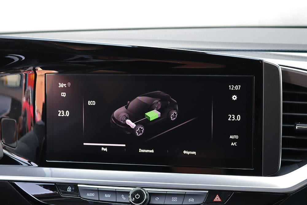 Η μέγιστη μεικτή αυτονομία σύμφωνα με την Opel φτάνει τα 324 χλμ., αλλά στην πράξη και με κανονική χρήση θα φτάσετε σίγουρα τα 260 χλμ. με μια φόρτιση. Σύμφωνα με την Opel η κατανάλωση ηλεκτρικής ενέργειας αγγίζει τα 17,4 kWh/100 χλμ., ενώ κατά τη δοκιμή μας βρέθηκε κοντά στις 19 kWh/100 χλμ. Παράλληλα, ο οδηγός έχει στη διάθεσή του τρία προγράμματα οδήγησης (Eco, Normal, Sport) που επεμβαίνουν ανάλογα στην απόκριση του κινητήρα και στην απόδοση του κλιματισμού (στο Eco) διαμορφώνοντας την αυτονομία. Σχετικά με τη φόρτιση, με τον στάνταρ φορτιστή 7,4 kW, μονοφασικό (ο 11 kW, τριφασικός χρεώνεται επιπλέον 700 ευρώ), για να φορτίζει από 0-100% σε μια απλή πρίζα σπιτιού 1,8 kW χρειάζονται 31 ώρες και 10 λεπτά. Mέσω του πιο κατάλληλου wallbox ισχύος 11 kW ο χρόνος μειώνεται κατά πολύ, στις 5 ώρες και 15 λεπτά.