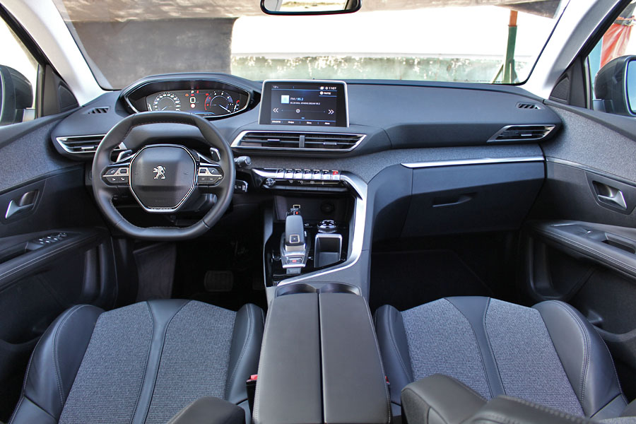 Κλείνοντας τη βαριά πόρτα του οδηγού έρχεσαι αντιμέτωπος με το πραγματικό highlight ολόκληρης της κατασκευής. Ο σχεδιασμός του εσωτερικού είναι εντυπωσιακός, με το i-Cockpit να δίνει δυναμικό παρόν μέσω του πλήρως ψηφιακού πίνακα οργάνων των 12,3 ιντσών και της ευμεγέθους οθόνης αφής των 8 ιντσών στο κέντρο του ταμπλό. Η σχεδίαση και η υφή των διακοπτών της κεντρικής κονσόλας βρίσκονται σε πολύ καλά επίπεδα, κάτι που ισχύει για την πλειονότητα των υλικών που χρησιμοποιούνται σε ταμπλό και πόρτες.