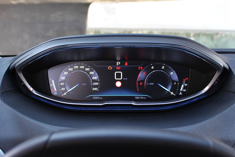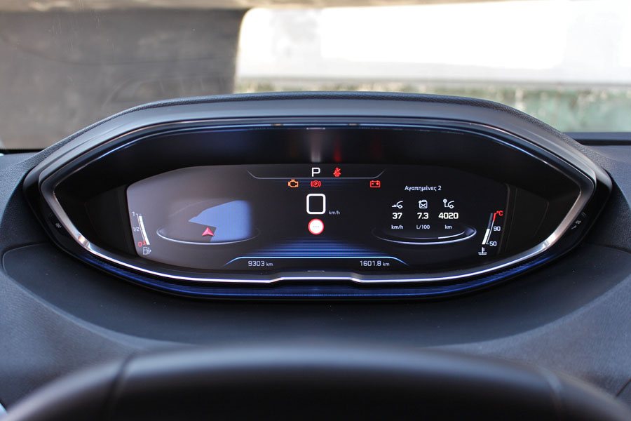 Κλείνοντας τη βαριά πόρτα του οδηγού έρχεσαι αντιμέτωπος με το πραγματικό highlight ολόκληρης της κατασκευής. Ο σχεδιασμός του εσωτερικού είναι εντυπωσιακός, με το i-Cockpit να δίνει δυναμικό παρόν μέσω του πλήρως ψηφιακού πίνακα οργάνων των 12,3 ιντσών και της ευμεγέθους οθόνης αφής των 8 ιντσών στο κέντρο του ταμπλό. Η σχεδίαση και η υφή των διακοπτών της κεντρικής κονσόλας βρίσκονται σε πολύ καλά επίπεδα, κάτι που ισχύει για την πλειονότητα των υλικών που χρησιμοποιούνται σε ταμπλό και πόρτες.