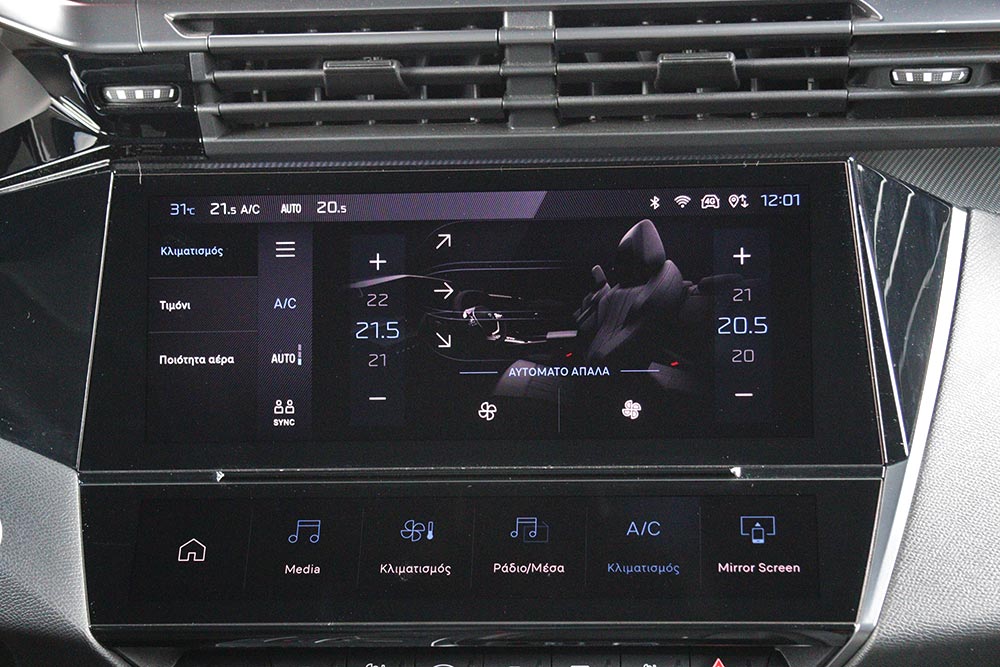 Στο μεσαίο επίπεδο κυριαρχεί η ευανάγνωστη και με γραφικά υψηλής ευκρίνειας οθόνη των 10 ιντσών του infotainment. Κάτω από αυτή είναι τοποθετημένα πλήκτρα αφής (i-toggles) που λειτουργούν ως συντομεύσεις του συστήματος και βελτιώνουν την εργονομία, μαζί με τους φυσικούς διακόπτες. Ο οδηγός του νέου 308 κάθεται άνετα στο κάθισμα με την ενισχυμένη πλευρική στήριξη και έχει στη διάθεσή του πολλές ρυθμίσεις για αυτό και το τιμόνι. Όμως, παρά τη μικρή του διάμετρο κρύβει ένα μεγάλο μέρος του πίνακα οργάνων και είναι κάτι που ενδέχεται να ενοχλήσει κάποιους οδηγούς. Από πλευράς χώρων, ο θάλαμος επιβατών του νέου 308 θα βολέψει άνετα τέσσερα άτομα, με έναν ακόμα στο πίσω κάθισμα να χωράει χωρίς πολύ στρίμωγμα. Για τις αποσκευές τα 412 λίτρα είναι αρκετά και αξιοποιούνται πλήρως από το μεγάλο άνοιγμα και τα επίπεδα τοιχώματα.