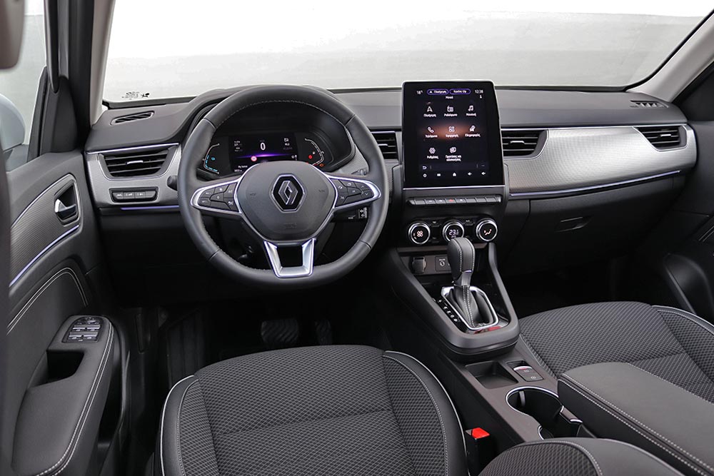 Από το θάλαμο των επιβατών του Arkana δεν λείπει τίποτα, καθώς είναι προσεγμένος σε ποιότητα, ευρύχωρος και εφοδιασμένος με όλα σύγχρονα συστήματα. Το ταμπλό ακολουθεί τα αισθητικά πρότυπα των Clio και Captur και διακρίνεται από τις ευθείες γραμμές και τις επίπεδες επιφάνειες. Στο κέντρο κυριαρχεί το σύστημα πολυμέσων Renault EASY LINK με την οθόνη αφής των 9,3 ιντσών (7 ιντσών στην πρώτη έκδοση), με το εύκολο μενού και τα μοντέρνα γραφικά. Επίσης, ο ψηφιακός και διαμορφώσιμος πίνακας οργάνων έχει διαγώνιο 7 ιντσών ή προαιρετικά 10,2 ιντσών (4,2 ιντσών το αρχικό Expression). Την πρακτικότητα ενισχύουν με τη σειρά τους η πολύ καλή θέση οδήγησης, οι αρκετές θήκες και οι τέσσερις θύρες USB (δύο μπροστά και δύο πίσω). Μειονέκτημα αποτελεί η περιορισμένη ορατότητα προς τα πίσω, λόγω της έντονης κλίσης του παρμπρίζ. Όμως στο παρκάρισμα δεν υπάρχει πρόβλημα, γιατί περιλαμβάνονται στάνταρ κάμερα οπισθοπορείας και αισθητήρες παρκαρίσματος εμπρός – πίσω. Από πλευράς κατασκευής, ολόκληρο το πάνω μέρος του ταμπλό και των θυρών αποτελείται από μαλακό πλαστικό, η συναρμογή είναι γεροδεμένη και ο ευχάριστος διάκοσμος ενσωματώνει πολυτελή στοιχεία.
