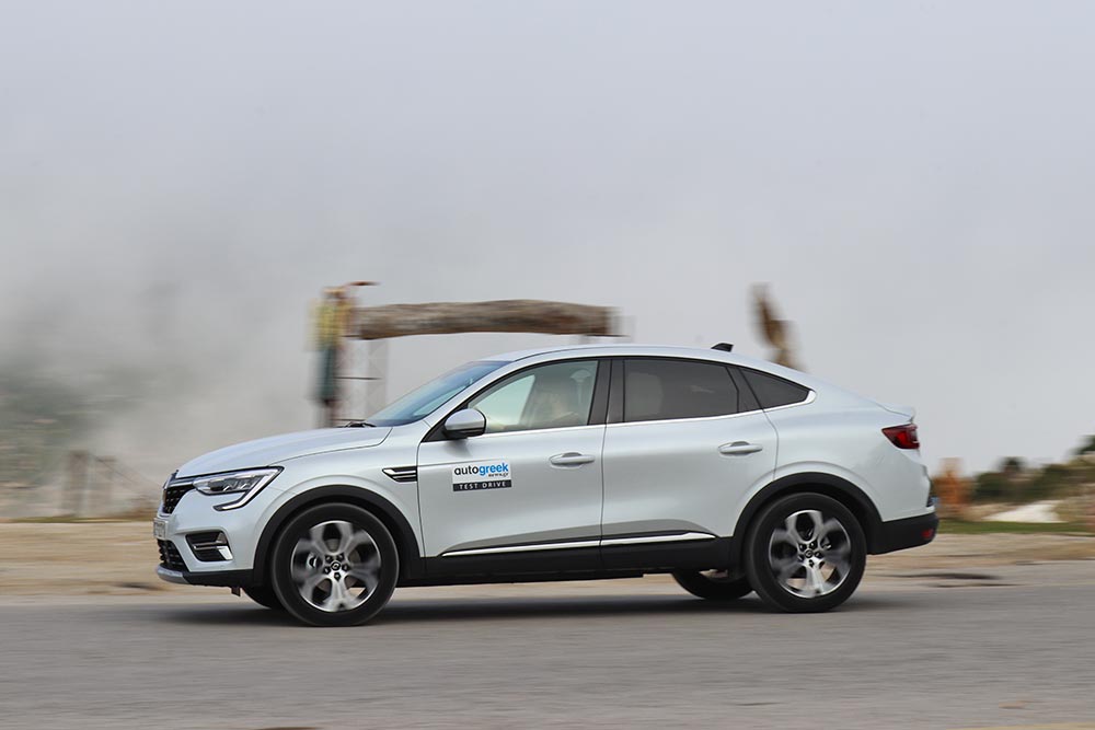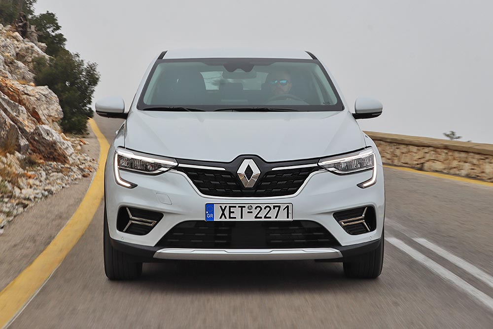 Στην πράξη το Arkana καταφέρνει και καλύπτει αρκετές αποστάσεις σε χαμηλές ταχύτητες πόλης με τη χρήση της ηλεκτρικής ενέργειας, που αντλείται από την μπαταρία ιόντων λιθίου των 1,2 kWh (βρίσκεται στο δάπεδο του χώρου αποσκευών). Χάρη στο σύστημα ανάκτησης ενέργειας κατά το φρενάρισμα, εξασφαλίζεται η επαναφόρτιση της μπαταρίας κατά την οδήγηση και σε συνεργασία με το πρόγραμμα «B» (Brake) από τον επιλογέα των ταχυτήτων, ο βαθμός ανάκτησης μεγιστοποιείται. Πρόσθετα, η ροπή είναι άμεσα διαθέσιμη από τις πολύ χαμηλές στροφές, λόγω του ηλεκτροκινητήρα. Με σχετικά προσεκτική οδήγηση στην πόλη, ο βενζινοκινητήρας λειτουργεί λίγες φορές, με αποτέλεσμα να εξοικονομείται πολύτιμο καύσιμο. Εμείς σε μεικτές συνθήκες πετύχαμε κατανάλωση 4,5 λτ./100 χλμ., κυρίως με την επιλογή Regular στο σύστημα ισχύος. Όσον αφορά τους ρυθμούς επιταχύνσεων ικανοποιεί και διατηρεί χωρίς πρόβλημα σβέλτες ταχύτητες, δίχως οι επιβάτες να ενοχλούνται από θορύβους. Ωστόσο όπως στα περισσότερα full hybrid, έτσι και στο Arkana όταν ζητηθεί πλήρης ισχύς, το μηχανικό σύνολο βενζίνης ακούγεται γιατί ανεβάζει υψηλές στροφές.