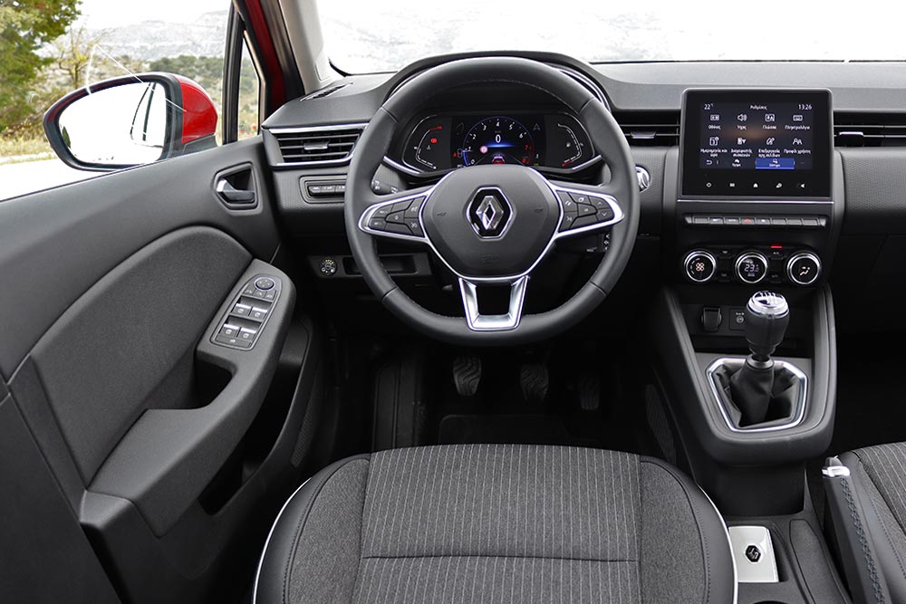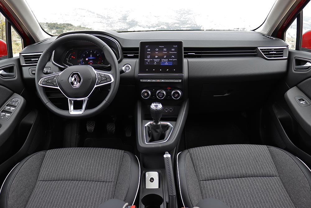 Η καμπίνα του γαλλικού μοντέλου διπλού καυσίμου, επίσης κινείται στα ποιοτικά πρότυπα που έχουμε γνωρίσει από τις υπόλοιπες εκδόσεις του. Τα υλικά που έχουν χρησιμοποιηθεί είναι μαλακά στο μεγαλύτερο μέρος του ταμπλό, της κεντρικής κονσόλας και στις επενδύσεις των εμπρός θυρών, ενώ σε αυξημένο επίπεδο βρίσκεται η εργονομία, αλλά και η πρακτικότητα που προσφέρει το Clio. Στο ανώτερο σημείο της κεντρικής κονσόλας (στην έκδοση της δοκιμής μας) ξεχωρίζει η εύχρηστη κι έγχρωμη οθόνη αφής 7 ιντσών (στον προαιρετικό εξοπλισμό υπάρχει και μεγαλύτερη οθόνη 9,3 ιντσών), με το χειρισμό της να είναι εξαιρετικά εύκολος.