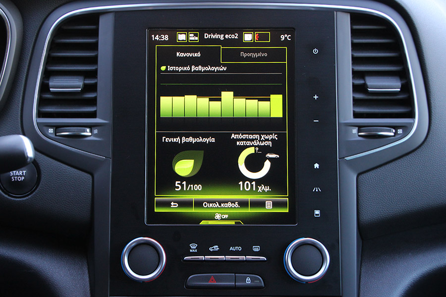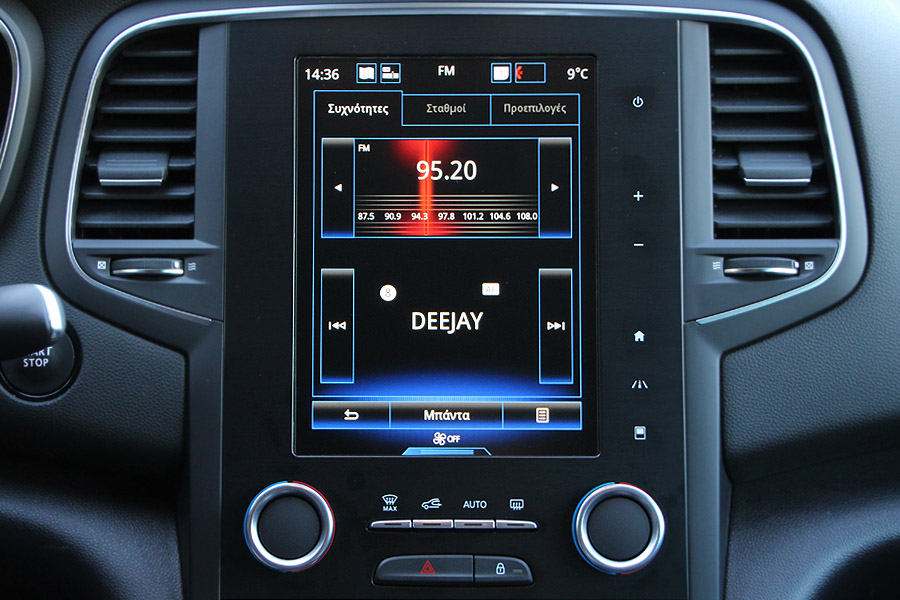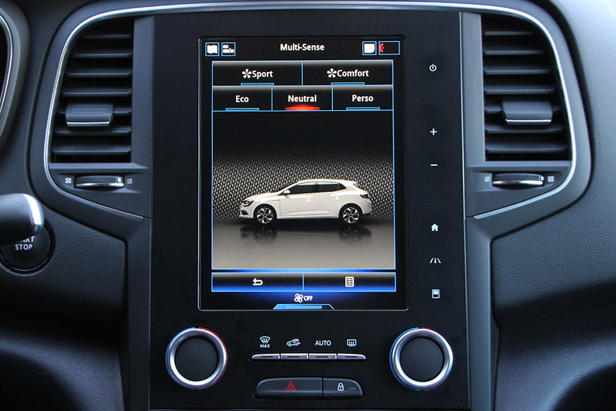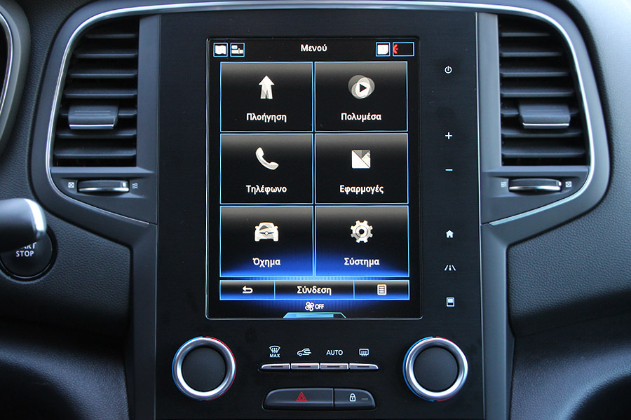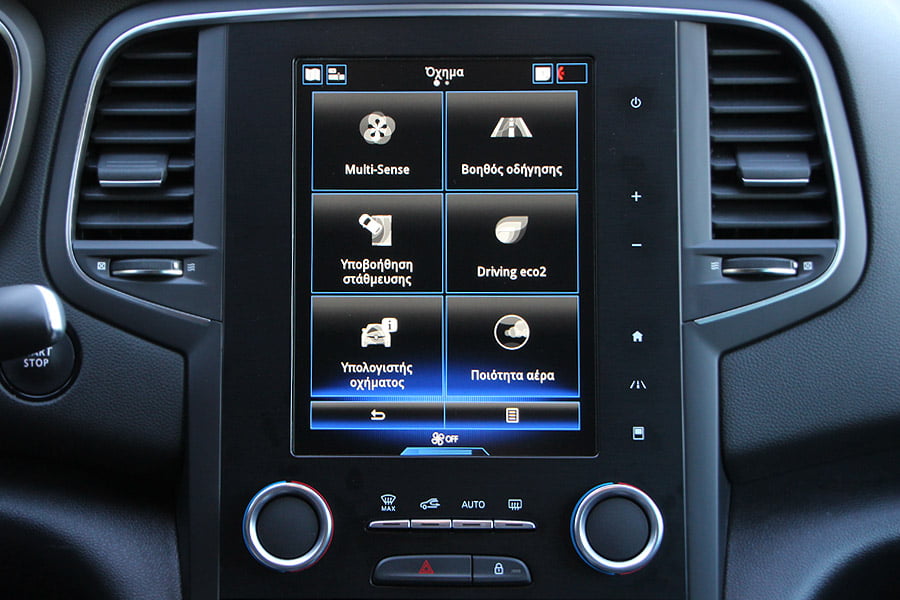Στο θάλαμο των επιβατών του Megane, το πρώτο στοιχείο που τραβάει τα βλέμματα, είναι η κάθετη οθόνη αφής των 8,7 ιντσών του συστήματος πολυμέσων R-Link 2. Περιλαμβάνει πάρα πολλές λειτουργίες για το ηχοσύστημα, το σύστημα πλοήγησης, το πρόγραμμα οικονομικής οδήγησης, τα συστήματα ασφαλείας και άνεσης του αυτοκινήτου, τον κλιματισμό κ.λπ.