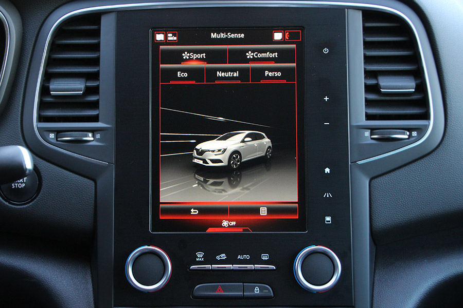 Επιπλέον, απεικονίζονται και τα προγράμματα οδήγησης του Multi-Sense (Neutral, Sport, Comfort, Eco και Perso). Συνολικά χρειάζεται αρκετό χρόνο εκμάθησης, λόγω των πολλών υπομενού, ενώ απουσιάζει ένα περιστροφικό χειριστήριο για την ένταση του ήχου. Με κάθε μια από τις επιλογές του Mutli-Sense αλλάζουν οι ενδείξεις του πίνακα οργάνων, ο φωτισμός του εσωτερικού, ο ήχος του κινητήρα, η απόκριση στο πάτημα του γκαζιού και το βάρος του τιμονιού.