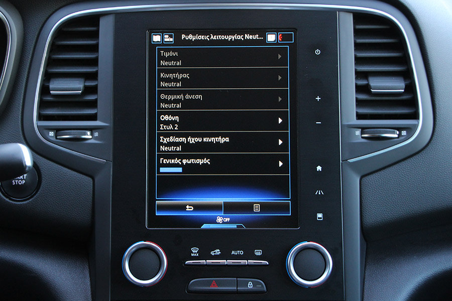 Το πρόγραμμα Neutural είναι το πιο κατάλληλο για όλες τις συνθήκες, αφού με αυτό, το Megane εμφανίζει ισορροπημένα συνολικά χαρακτηριστικά, κινείται ευχάριστα, οικονομικά και σβέλτα. Με την επιλογή Sport ο κινητήρας ανεβάζει πιο ψηλά στροφές, έχει πιο άμεση απόκριση και το τιμόνι γίνεται πιο βαρύ, ικανοποιώντας περισσότερο σε μια διαδρομή με στροφές. Εκεί ο οδηγός είναι σε θέση να εξαντλήσει τα αποθέματα ισχύος του κινητήρα και να κινηθεί γρήγορα, έχοντας τον έλεγχο του αυτοκινήτου, χάρη στην ομοιογενή και ουδέτερη συμπεριφορά του. Μεταξύ των σημείων αναφοράς είναι και τα αποτελεσματικά φρένα.
