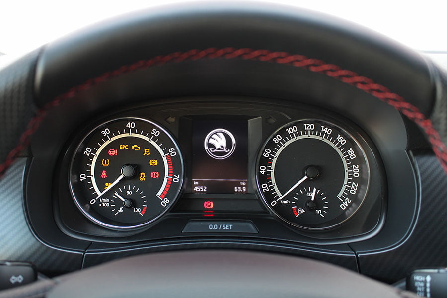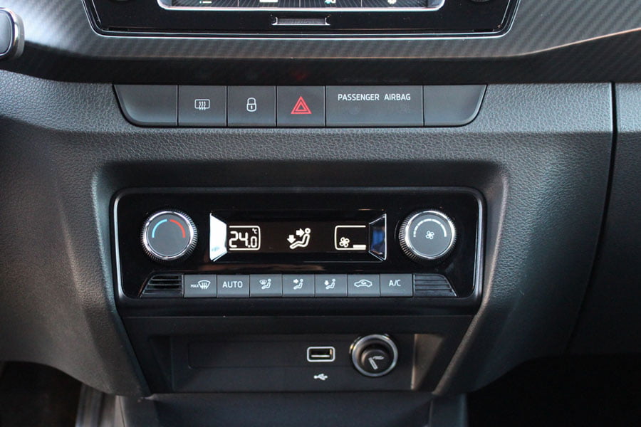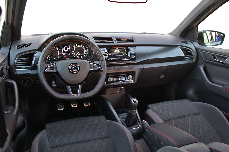 Σπορτίφ στοιχεία συναντώνται και στο θάλαμο των επιβατών της Fabia Monte Carlo με τον σκουρόχρωμο διάκοσμο. Το μαύρο χρώμα κυριαρχεί σε όλα τα πλαστικά, στην οροφή, τις κολόνες και την κεντρική κονσόλα. Ευχάριστη νότα αποτελούν οι κόκκινες ραφές στο δερμάτινο διάτρητο flat bottomed τιμόνι, στη βάση του επιλογέα των ταχυτήτων στα υποβραχιόνια των εμπρός θυρών και στο υποβραχιόνιο ανάμεσα από τα εμπρός καθίσματα. Τα τελευταία διαθέτουν και αυτά κόκκινες ραφές καθώς και τονισμένη πλευρική ενίσχυση, παρέχοντας πολύ καλή στήριξη στο σώμα χωρίς να κουράζουν.