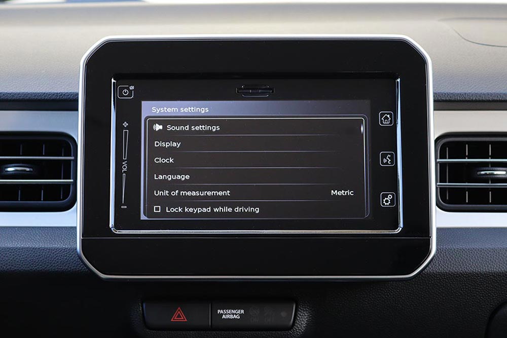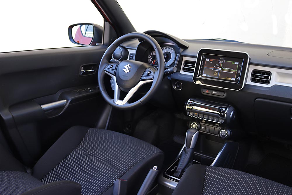 Σε πρώτο πλάνο στο εσωτερικό του Ignis, βρίσκονται η πρακτικότητα, η εργονομία, η ευρυχωρία και αντοχή στο πέρασμα του χρόνου. Όλες οι επιφάνειες της καμπίνας είναι πλήρως επενδυμένες με σκληρά πλαστικά, προσεγμένα σε ποιότητα, συναρμογή και φινίρισμα. Στο κέντρο του ταμπλό κυριαρχεί η οθόνη αφής των 7 ιντσών του συστήματος πολυμέσων, ενώ πιο κάτω συναντάμε τα χειριστήρια του κλιματισμού. Μοντέρνα εικόνα έχει και ο πίνακας οργάνων με τις αναλογικές ενδείξεις και την οθόνη πολλαπλών ενδείξεων. Σε αυτή απεικονίζεται και η λειτουργία του ήπιου υβριδικού συστήματος.