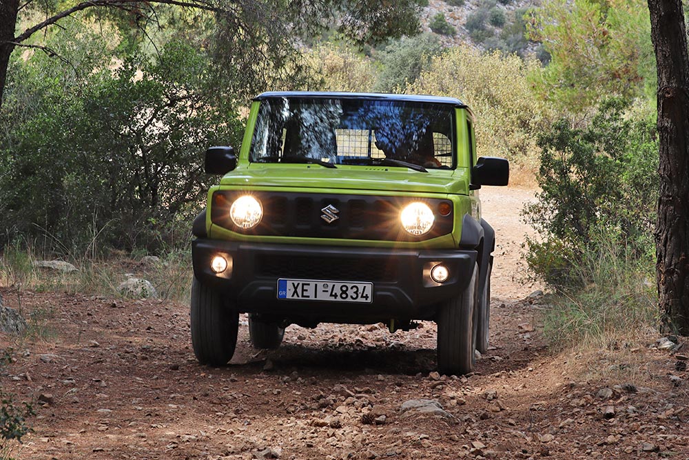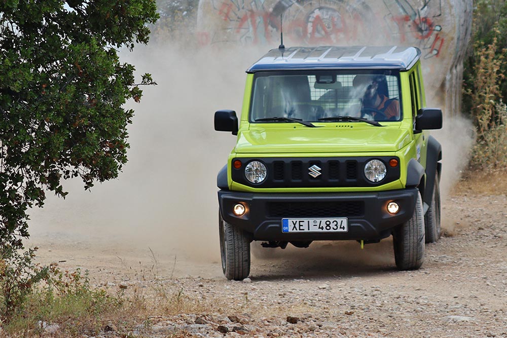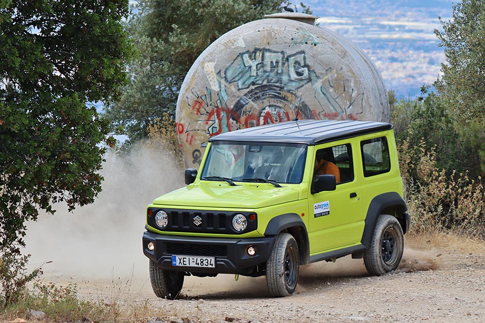 Όπως είπαμε, όμως, Jimny εστί off-roading. Το τιμόνι μένει σταθερό και αφήνει τα χέρια σου ανεπηρέαστα ακόμα κι αν χτυπήσεις βράχο, τα φρένα -με το hill descent control- σου επιτρέπουν να κατεβαίνεις πλαγιές αγόγγυστα, η κοντή κλιμάκωση του κιβωτίου και οι κοντοί πρόβολοι «καταπίνουν» πλαγιές και αναχώματα, οι άκαμπτοι άξονες και το μαλακό setup της ανάρτησης απορροφούν ακόμα και κρατήρες.