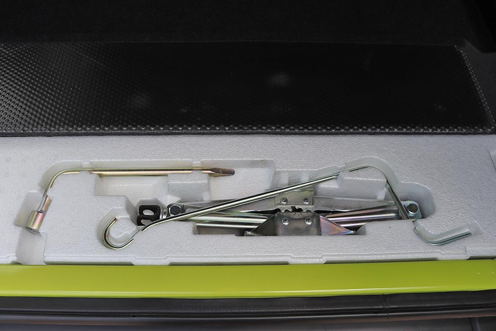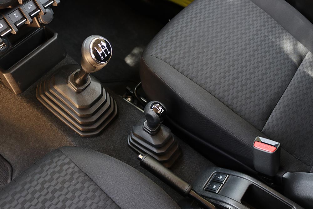 Το μικρό Suzuki θυμίζει G-Wagen υπό κλίμακα, με τους ελάχιστους προβόλους να μεγιστοποιούν τα 3.645 χλστ. του μήκους (μαζί με τη ρεζέρβα, 3.480 χλστ. από άκρη σε άκρη προφυλακτήρα) και τις κάθετες γραμμές να του χαρίζουν μοναδική αύρα. Οι παρατηρητικοί θα δουν πως πίσω απουσιάζουν τα καθίσματα και στις πλάτες των εμπρός, υπάρχει το κλασικό προστατευτικό μεταλλικό πλέγμα των επαγγελματικών. Ανοίγοντας την πόρτα, έρχεσαι αντιμέτωπος με τη γνώριμη εικόνα της απλότητας στο εσωτερικό του Jimny. Εδώ δεν υπάρχουν οθόνες αφής και ψηφιακά καντράν. Ένα παραδοσιακό ράδιο CD με MP3, μια μικρή οθόνη LCD μεταξύ στροφόμετρου και ταχύμετρου, δυο λεβιέδες για τα κιβώτια (κανονικό και «αργό»), ισάριθμα καθίσματα και τέλος! Απλά, ωραία και εύχρηστα.