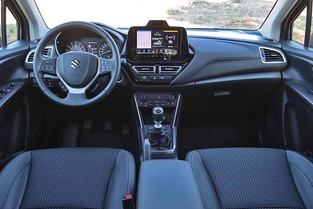 Στα ενδότερα του S-Cross τώρα, ο συνδυασμός ποιότητας, εργονομίας και ευρυχωρίας σε κερδίζει με το που καθίσεις στη θέση του οδηγού (ή κάποια από των επιβατών). Το ταμπλό χαρακτηρίζεται από την εύχρηστη οθόνη αφής 9 ιντσών και το μαλακό πλαστικό, ιδίως μπροστά από το συνοδηγό, που ανεβάζει σε επίπεδο την ποιότητα. Η συναρμογή διατηρείται σε κορυφαίο επίπεδο, όπως και η εργονομία. Μοναδικό μειονέκτημα η ανάγκη για περιττή περιήγηση σε μενού και υπομενού του infotainment, για λειτουργίες που θα μπορούσαν να ελέγχονται με δυο κουμπιά. Από τους χώρους, αντίθετα, δεν υπάρχει το παραμικρό παράπονο. Ακόμα και με την πανοραμική ηλιοροφή της συγκεκριμένης έκδοσης, 4 ενήλικες θα βολευτούν με όλη τους την άνεση σε πόδια-κεφαλή, ενώ 5 θα χρειαστεί να κάνουν πολύ λίγες παραχωρήσεις. Αρκετό με τη σειρά του είναι και το πορτ μπαγκάζ των 430 λίτρων με το χαμηλό κατώφλι φόρτωσης και το κανονικότατο σχήμα.