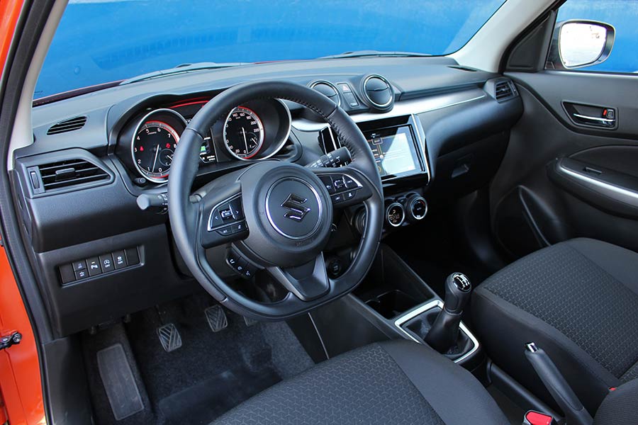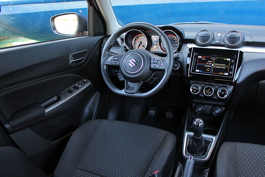 Η σπορτίφ σχεδιαστική φιλοσοφία του Swift γίνεται αντιληπτή και στο εσωτερικό, όπου δεν υπάρχει καμία αλλαγή στο ανανεωμένο μοντέλο. Στοιχεία όπως το τριάκτινο μικρής διαμέτρου τιμόνι με το επίπεδο κάτω μέρος, τα δύο κυκλικά όργανα με την οθόνη 4,2 ιντσών ανάμεσα σε αυτά, οι στρογγυλοί κεντρικοί αεραγωγοί και η οθόνη αφής των 7 ιντσών, συνθέτουν ένα μοντέρνο σύνολο. Ποιοτικά δεν ενθουσιάζει με τα σκληρά πλαστικά που έχουν χρησιμοποιηθεί στο ταμπλό και σε επιμέρους επιφάνειες. Σε επίπεδο χώρων, το Swift είναι σε θέση να μεταφέρει στο πίσω κάθισμα δύο ενήλικα άτομα, χωρίς να κάνουν παραχωρήσεις. Για τις αποσκευές, τα 265 λτ. επαρκούν για τις καθημερινές ανάγκες, όμως είναι σημαντικά λιγότερα έναντι άλλων αυτοκινήτων της κατηγορίας των μικρών (αλλά με μεγαλύτερες εξωτερικές διαστάσεις).