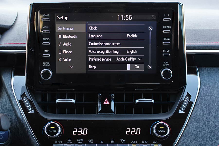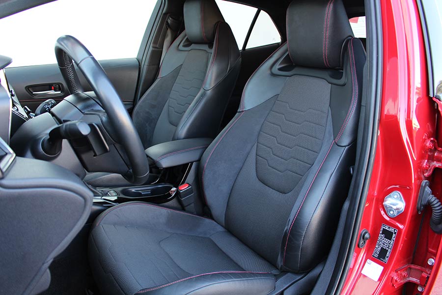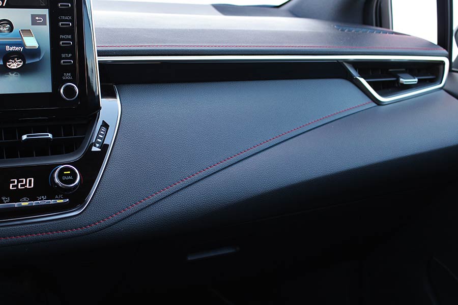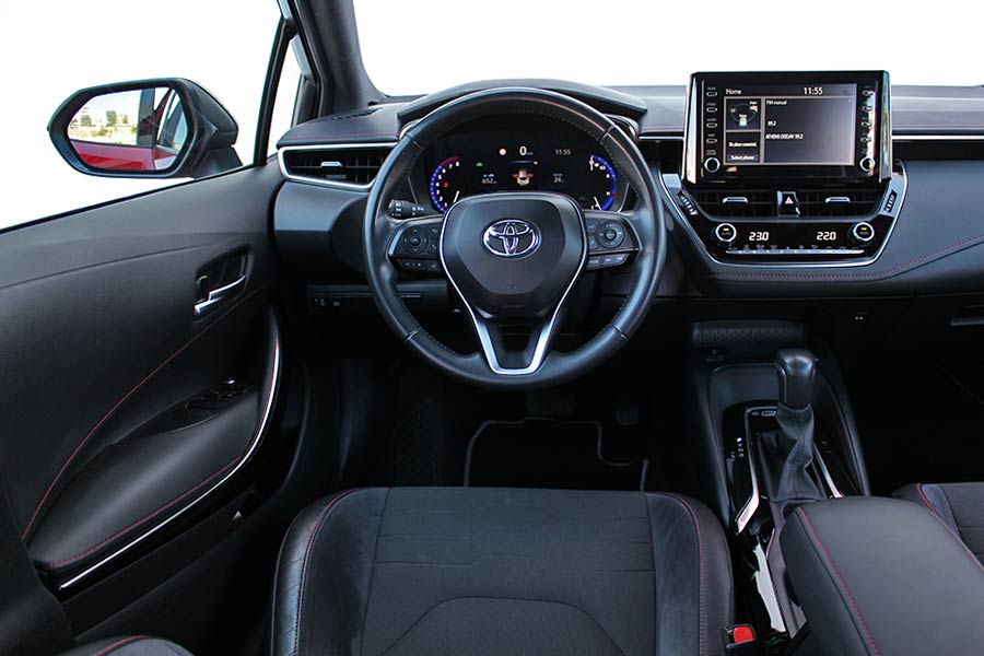Στο εσωτερικό, η εικόνα δεν διαφέρει ιδιαίτερα από όσα μας έχει συνηθίσει το Corolla. Οι δερμάτινες επενδύσεις στο ταμπλό και τις πόρτες με τις κόκκινες ραφές, συνοδεία των σπορ καθισμάτων προσδίδουν την απαραίτητη χροιά, αλλά θα μπορούσαν να υπάρχουν επενδύσεις αλουμινίου ή γενικότερα ένας διάκοσμος που θα σου έδινε περισσότερο να καταλάβεις ότι βρίσκεσαι στην κορυφαία και 180 ίππων Sport έκδοση.