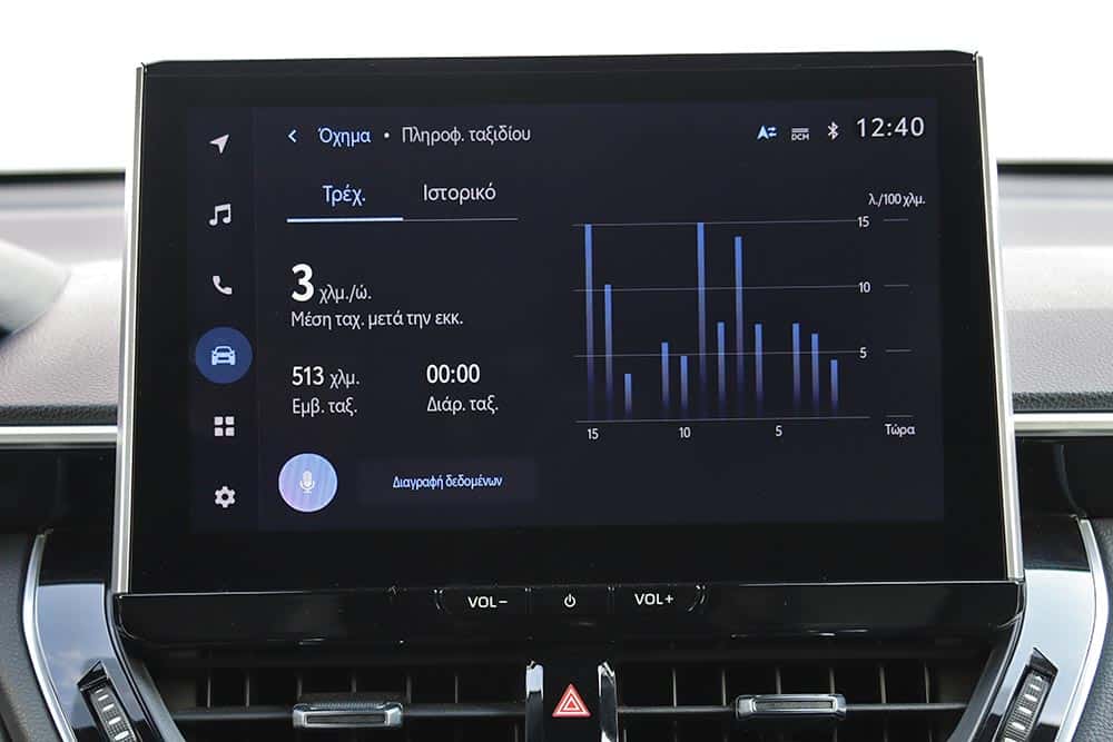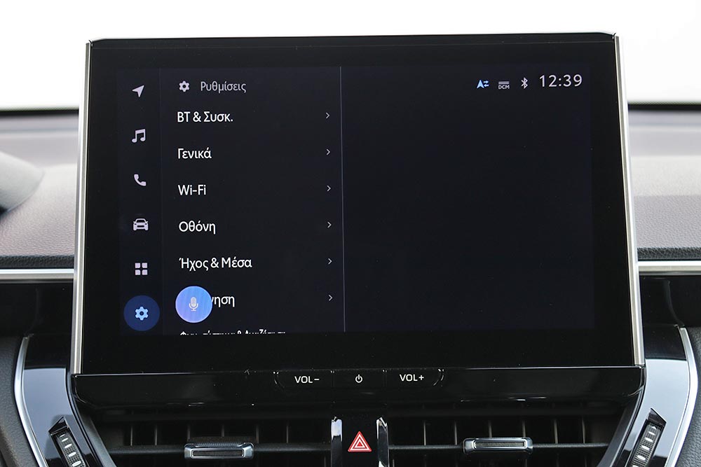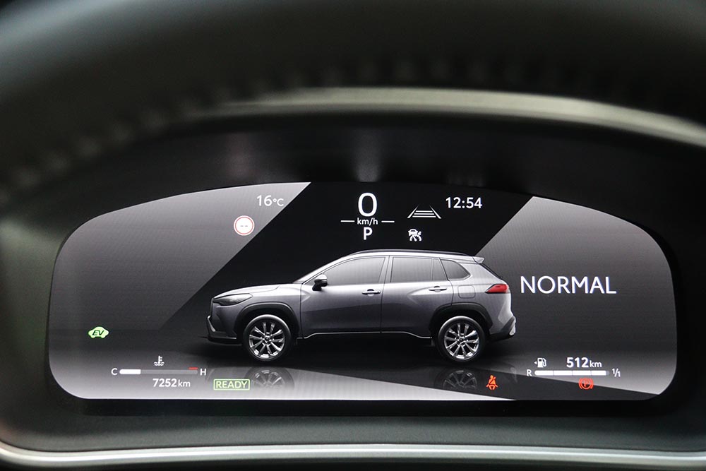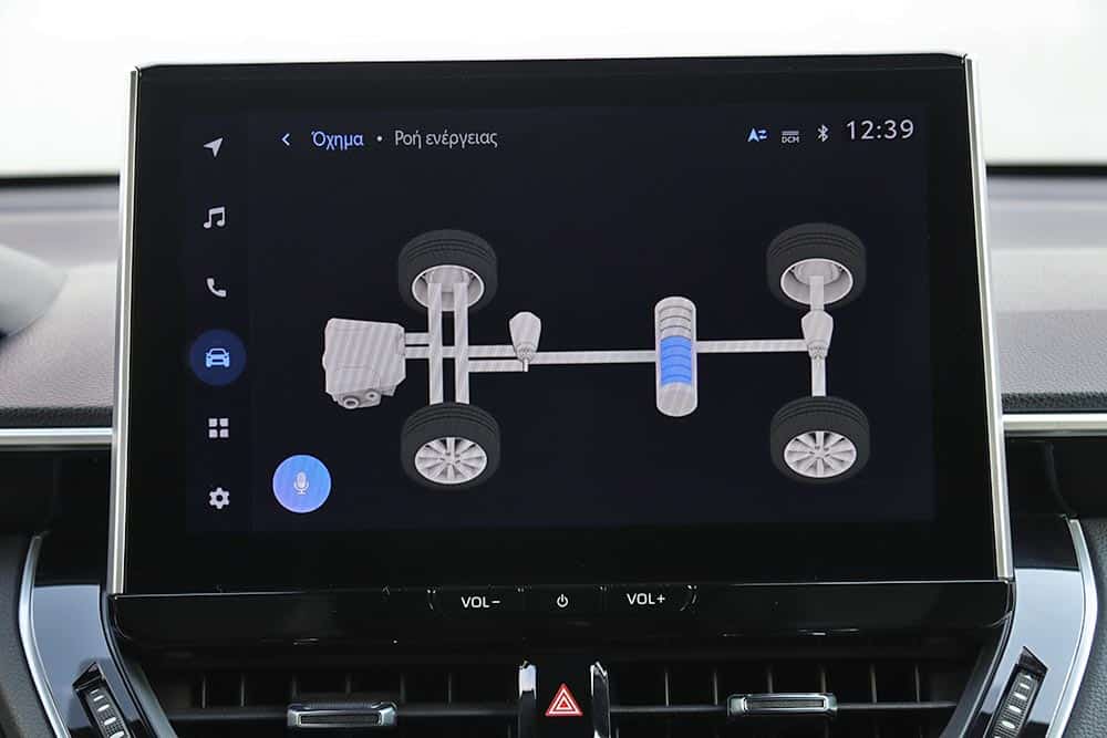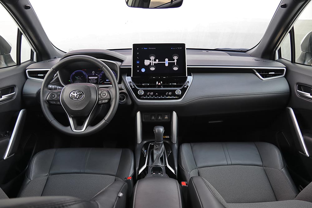 Στο εσωτερικό του νέου Corolla Cross η εικόνα είναι γνώριμη, αφού το ταμπλό του μοιάζει αρκετά με του Corolla. Σχεδιαστικά διαφέρει το εμπρός τμήμα από τη μεριά του συνοδηγού όπου είναι επενδυμένο με μαλακό υλικό, όμως το πάνω μέρος του αποτελείται από σκληρό πλαστικό (μαλακό στο Corolla και στο C-HR) και αυτό είναι κάτι που δεν συναντάται σε άλλο μικρομεσαίο SUV της τάξεως των 32.000+ ευρώ. Το Corolla Cross είναι το πρώτο μοντέλο της Toyota που χρησιμοποιεί το νέο (στάνταρ) ψηφιακό πίνακα οργάνων των 12,3 ιντσών, με δυνατότητα εξατομίκευσης σε τρία θέματα και ανάλογα με την επιλογή του Drive Mode (Eco, Normal, Power). Νέο, πιο ευκρινές και άμεσο είναι το σύστημα Toyota Smart Connect με την οθόνη αφής των 10,5 ιντσών, αν και μερικά γραφικά του είναι κάπως παρωχημένα (π.χ. για τη ροή της ενέργειας). Περιλαμβάνει -μεταξύ άλλων- over-the-air ενημερώσεις και 4 χρόνια δωρεάν λειτουργία πλοήγησης που βασίζεται σε cloud με πληροφορίες για κυκλοφοριακά συμβάντα σε πραγματικό χρόνο, ενσωματωμένο ψηφιακό βοηθό και ενσωμάτωση smartphone μέσω (ασύρματου) Apple CarPlay και (ενσύρματης σύνδεσης).