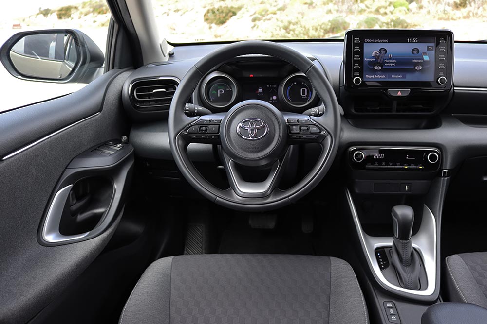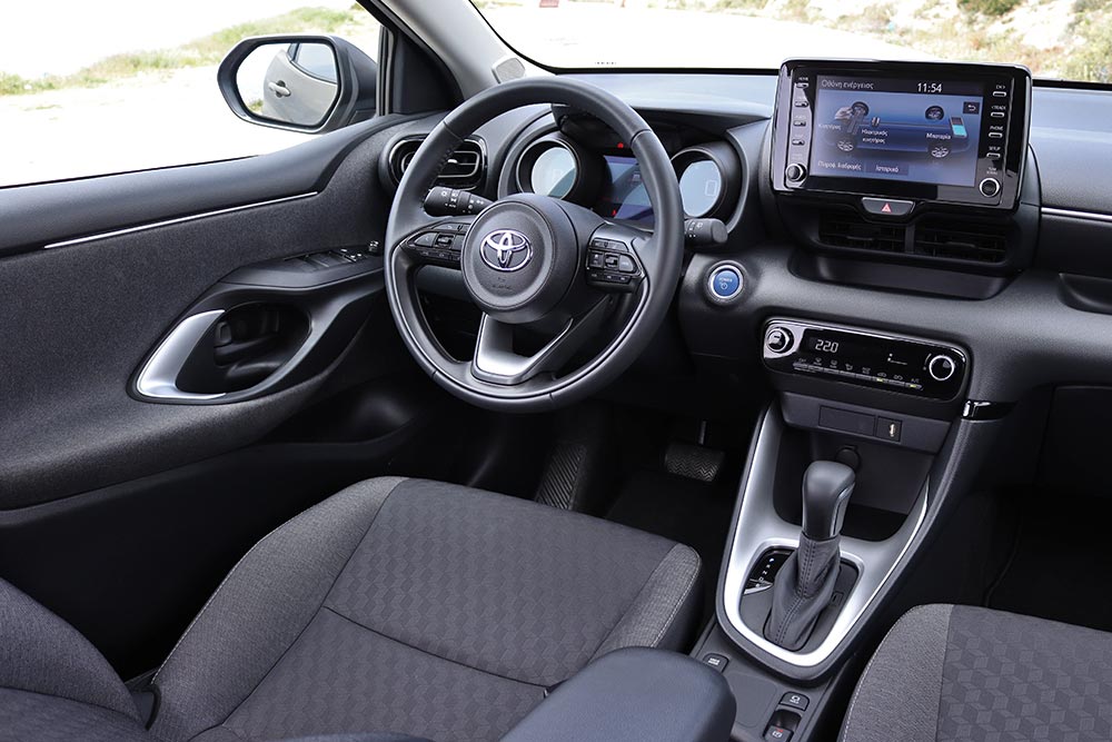 Η καμπίνα του νέου Yaris διαθέτει καλαίσθητο και νεανικό σχεδιασμό, κινούμενη σε πιο συμβατικές νόρμες συγκριτικά με το εξωτερικό. Τα υλικά είναι ποιοτικά και γεροδεμένα στο σύνολο τους, έχοντας ένα σεβαστό κομμάτι του ταμπλό με μαλακό πλαστικό. Η οθόνη αφής των 8 ιντσών (10 στις πλουσιότερες εκδόσεις) είναι εξαιρετικά εύχρηστη και απαιτεί ελάχιστο χρόνο εκμάθησης, καθώς όλες οι βασικές λειτουργίες (ηχοσύστημα, κλιματισμός κ.λπ.) ελέγχονται δίχως να χρειάζεται η περιήγηση σε μενού και υπομενού. Ο ψηφιακός πίνακας οργάνων (από την τρίτη έκδοση Style και άνω) είναι ιδιαίτερα ευχάριστος και ευανάγνωστος, με το ταχύμετρο και τη διαχείριση της ισχύος (αντί στροφόμετρου στο Hybrid) να απεικονίζονται σε δυο κυκλικά όργανα, που ανάμεσά τους έχουν μια μικρότερη οθόνη LCD για τα υπόλοιπα (cruise control και πιέσεις ελαστικών, για παράδειγμα). Η εργονομία σε γενικές γραμμές είναι απροβλημάτιστη, με τη μόνη παρένθεση να αφορά τους διακόπτες των ηλεκτρικών παραθύρων στην πόρτα του οδηγού, που είναι πολύ ψηλά.