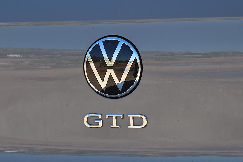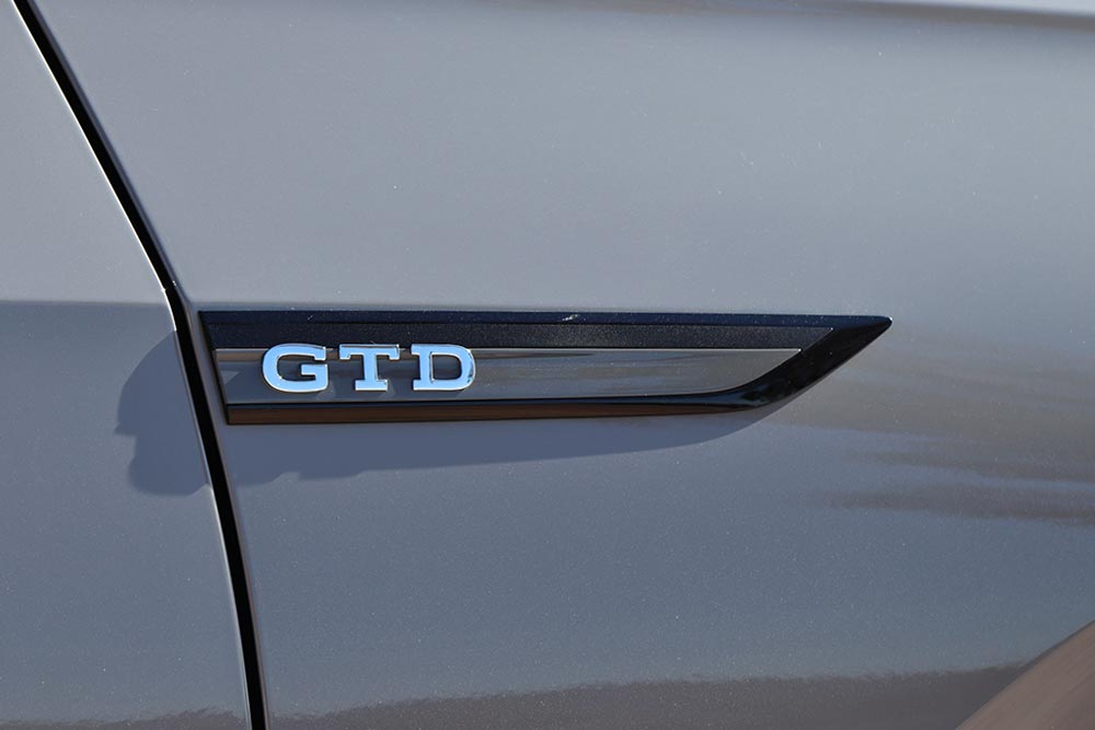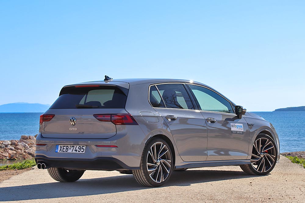 Η σύνδεση GTD-GTI γίνεται αυτόματα, μόλις δεις το γερμανικό hot hatch. Ο προφυλακτήρας με το διαμαντοειδές μοτίβο και τα αντίστοιχα φώτα ομίχλης κεντρίζουν το βλέμμα, όπως και οι προαιρετικές 19άρες ζάντες (17 ιντσών στάνταρ) Adelaide, δίνοντάς σου ευθύς αμέσως να καταλάβεις πως έχεις να κάνεις με ένα σπορ, αλλά όχι κραυγαλέο αυτοκίνητο. Οι πλαϊνές ποδιές οδηγούν το μάτι στο προστατευτικό του πίσω προφυλακτήρα, το οποίο -προς τιμήν του- δεν υποδύεται τον διαχύτη. Οι απολήξεις εδώ είναι διπλές στο αριστερό μέρος, αντί μία και μία όπως στο GTI, χαρίζοντας επιπλέον πόντους διακριτικότητας στο GTD.