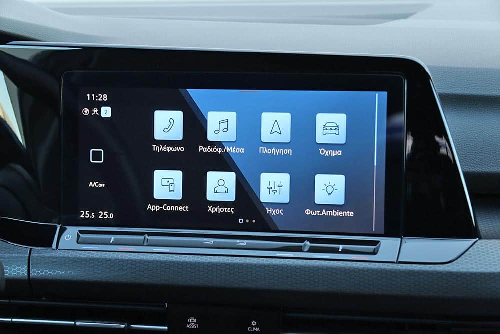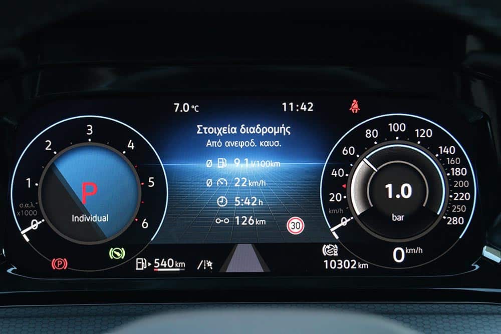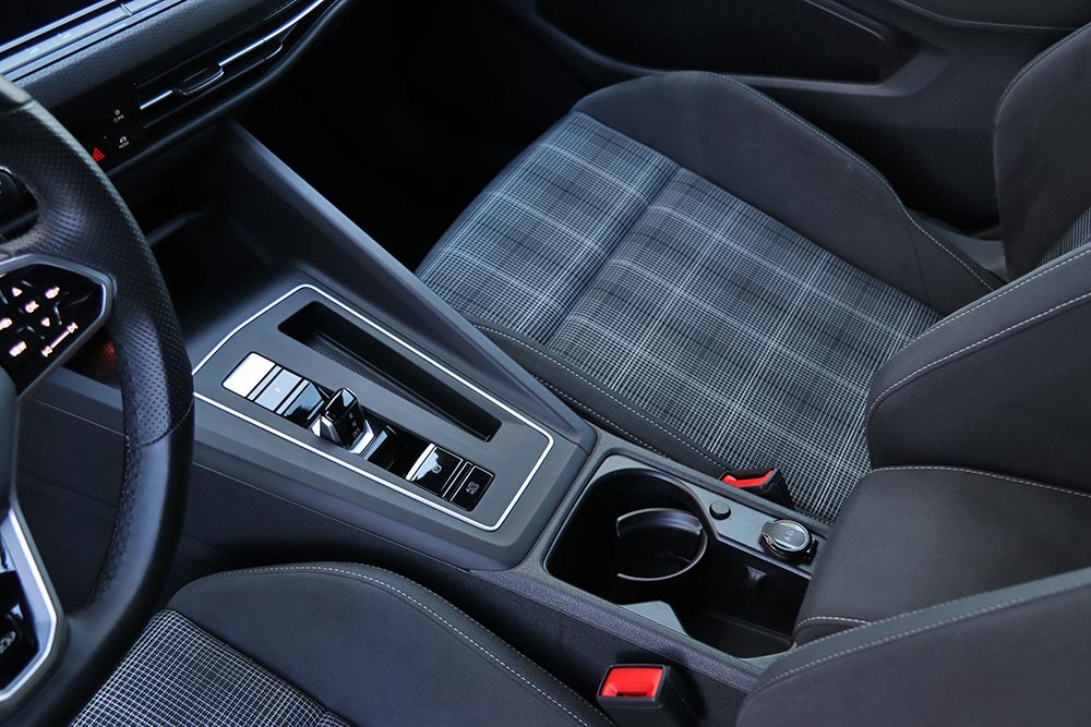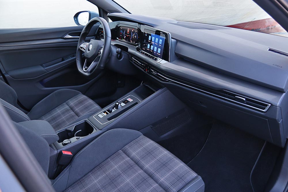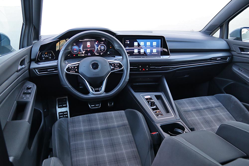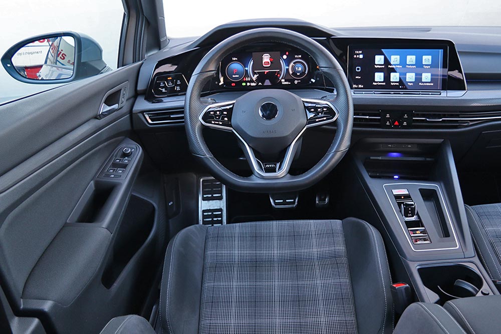 Ο δυναμισμός δεν λείπει ούτε από το εσωτερικό. Με το που ανοίγεις την πόρτα, το μάτι σου δέχεται τα κατάλληλα ερεθίσματα από τα μπάκετ καθίσματα, με το παραδοσιακό καρό μοτίβο του Golf GTI. Το δερμάτινο τιμόνι με το επίπεδο κάτω μέρος, τις κόκκινες ραφές και την απολαυστικά παχιά στεφάνη σε βάζει στο κλίμα, μαζί με την εξαιρετική θέση οδήγησης. Παράλληλα, το Innovision Cockpit με την διπλή διάταξη των οθονών 10 και 10,25 ιντσών (για πίνακα οργάνων και σύστημα πολυμέσων αντίστοιχα) χαρίζει την προαπαιτούμενη πια hightech νότα.