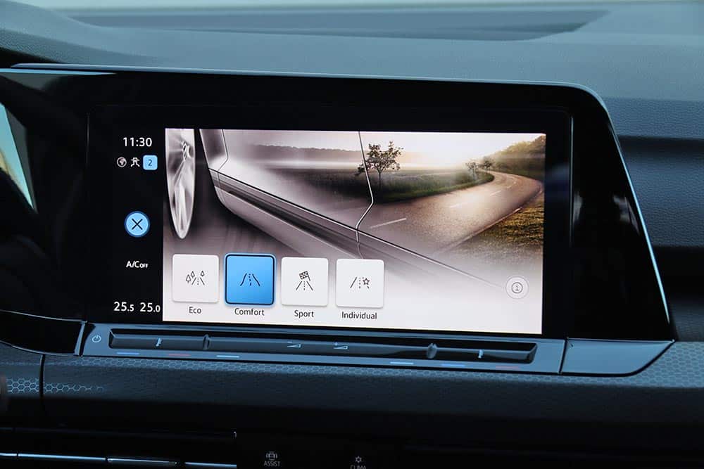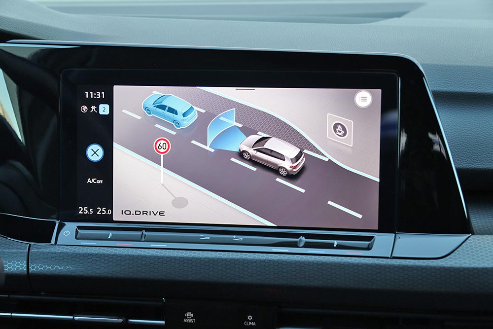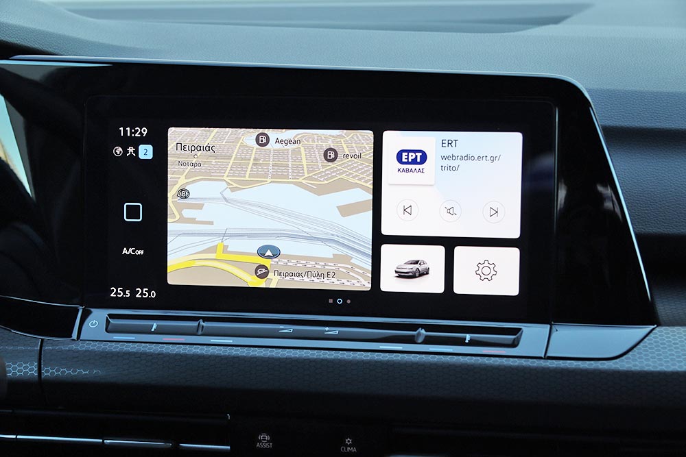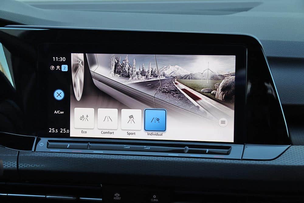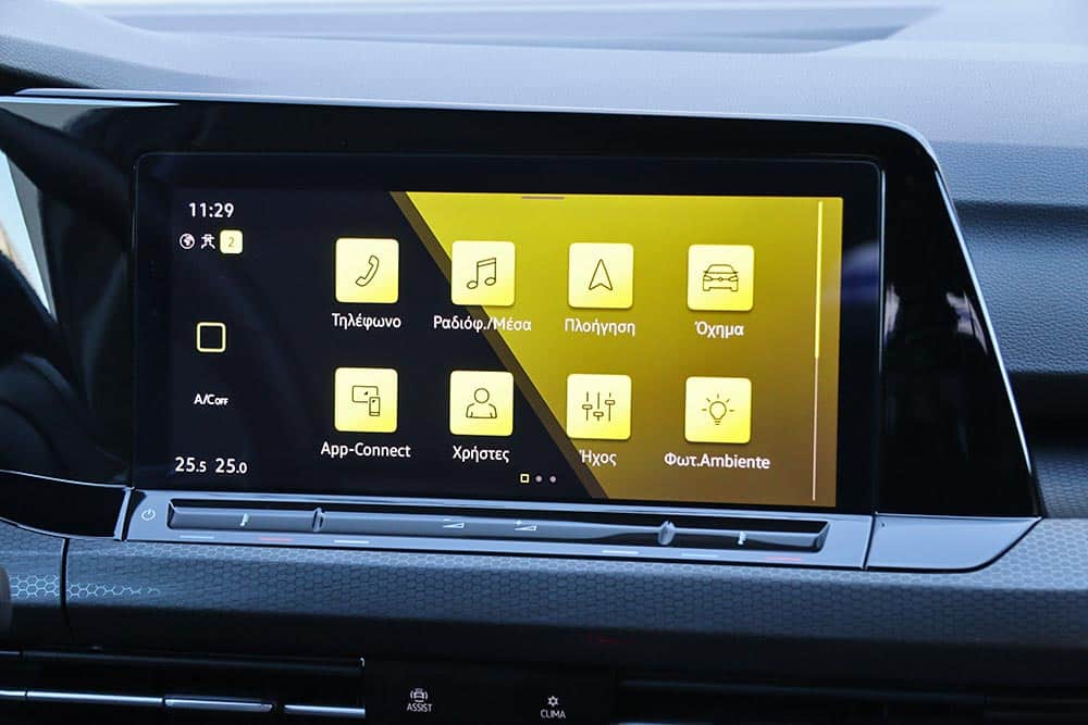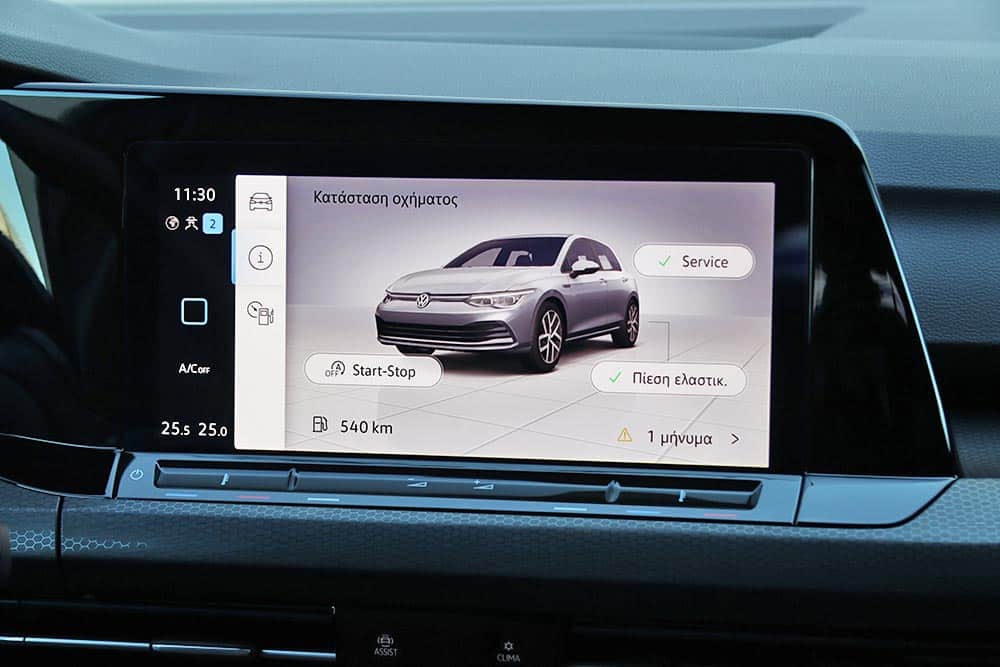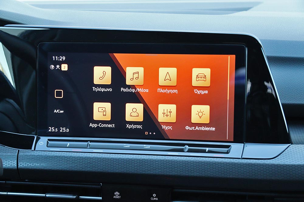 Ο δυναμισμός δεν λείπει ούτε από το εσωτερικό. Με το που ανοίγεις την πόρτα, το μάτι σου δέχεται τα κατάλληλα ερεθίσματα από τα μπάκετ καθίσματα, με το παραδοσιακό καρό μοτίβο του Golf GTI. Το δερμάτινο τιμόνι με το επίπεδο κάτω μέρος, τις κόκκινες ραφές και την απολαυστικά παχιά στεφάνη σε βάζει στο κλίμα, μαζί με την εξαιρετική θέση οδήγησης. Παράλληλα, το Innovision Cockpit με την διπλή διάταξη των οθονών 10 και 10,25 ιντσών (για πίνακα οργάνων και σύστημα πολυμέσων αντίστοιχα) χαρίζει την προαπαιτούμενη πια hightech νότα.
