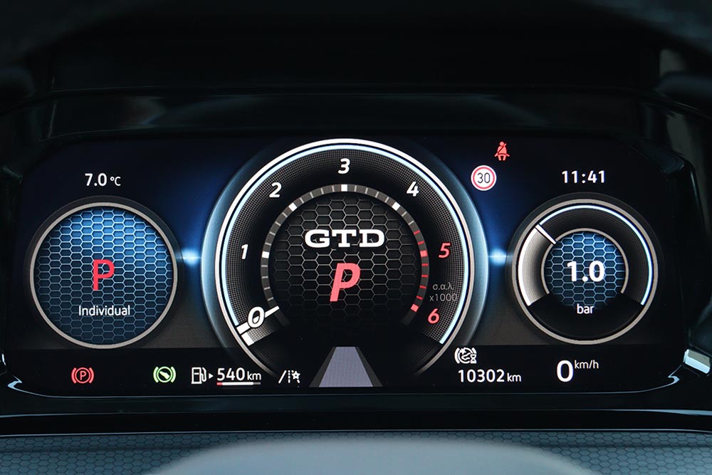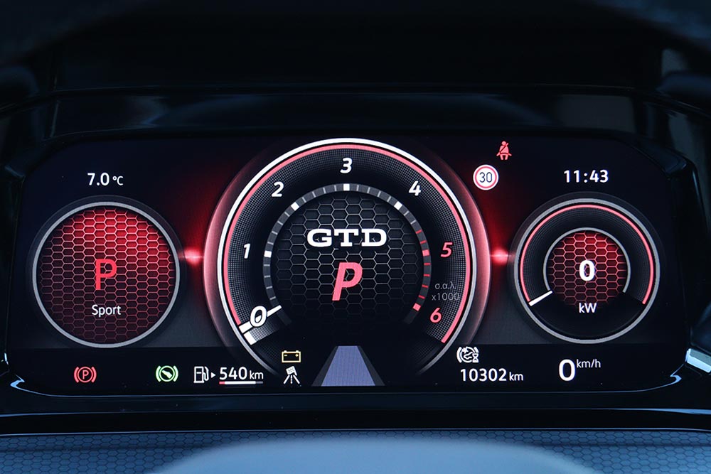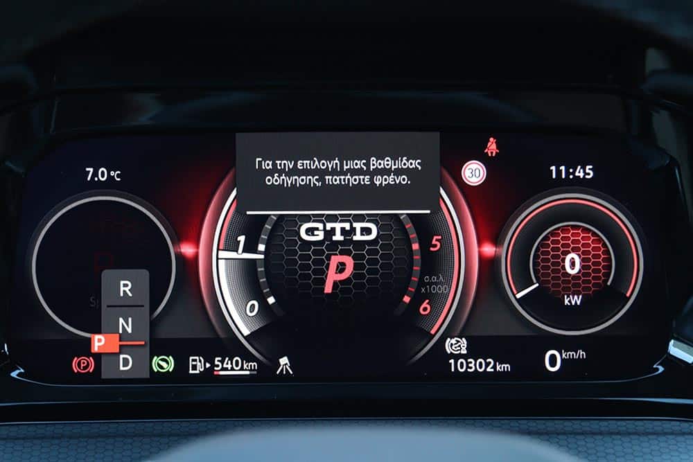 Η ουρά σπανιότατα θα το κάνει, μένοντας ως επί το πλείστον βιδωμένη. Θα ήθελες παραπάνω συμμετοχή από το πίσω μέρος, ειδικά στις κλειστές στροφές μετά από ευθεία – εκεί δηλαδή που το φρενάρισμα μέχρι μέσα θα μπορούσε να ισιώσει το αμάξωμα, βγάζοντάς σε από τη στροφή με ένα απλωμένο γλίστρημα και το τιμόνι στην ευθεία. Παρόλα αυτά, μόλις πιάσεις τον παλμό του GTD μπορείς να κινηθείς εξαιρετικά γρήγορα, γνωρίζοντας πως στη διάθεσή σου υπάρχει ένα ακούραστο και αποτελεσματικότατο σύστημα πέδησης.
