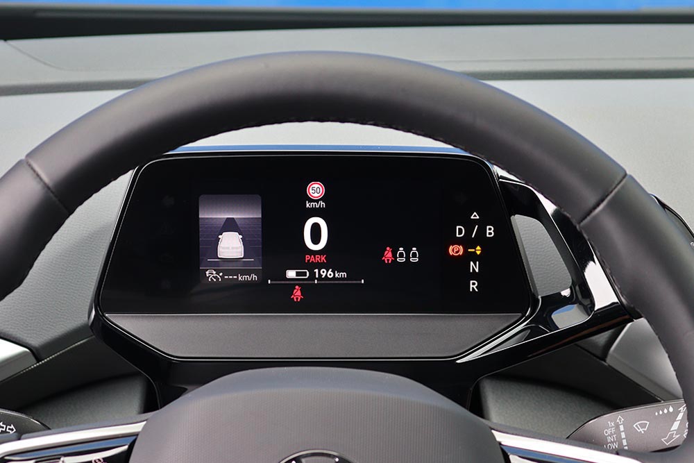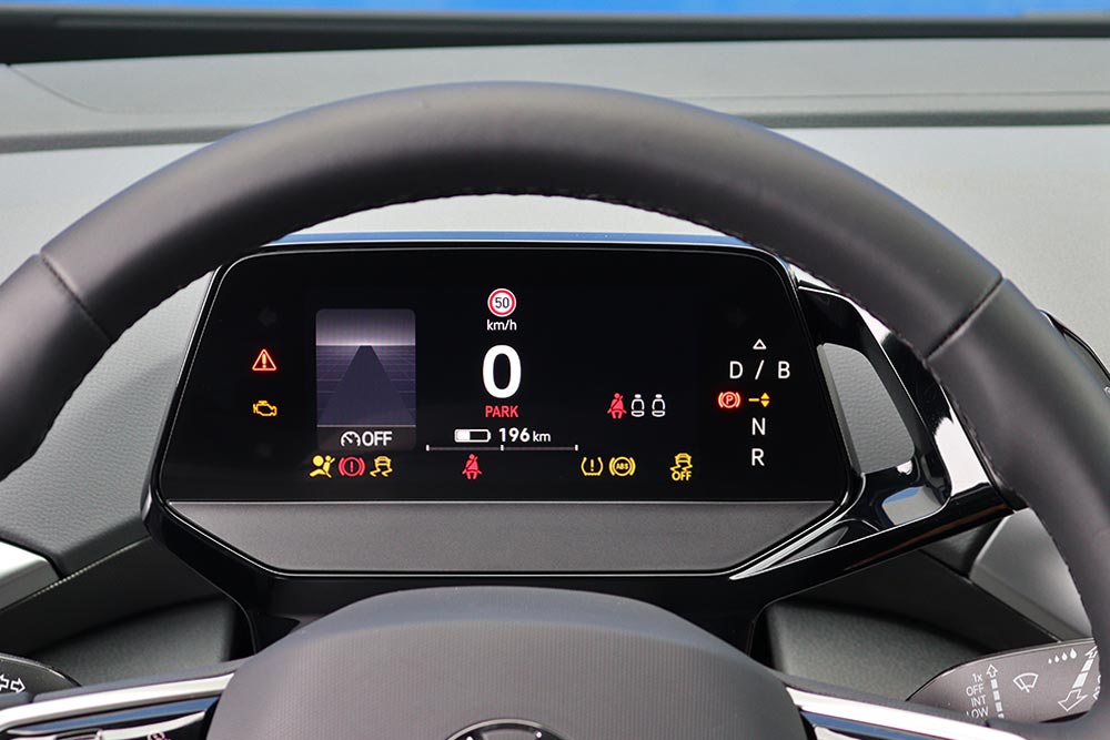Έχοντας συμβιώσει με το VW ID.3, η καμπίνα του ID.4 μας ήταν αρκετά οικεία, αφού φαίνεται να έρχεται σχεδόν αυτούσια από το μικρομεσαίο χάτσμπακ ηλεκτρικό της μάρκας. Η ποιότητα εδώ είναι καλύτερη, καθώς έχει γίνει χρήση καλύτερων υλικών, όπως είναι το μαλακό πλαστικό στο πάνω μέρος του ταμπλό. Οι σχεδιαστές επέλεξαν γραμμικά και καθαρά μοτίβα για την κατασκευή του ταμπλό, όπου ξεχωρίζει η οθόνη αφής 10 ιντσών (12 ιντσών στην 1st Max έκδοση). Μέσω αυτής ο οδηγός ελέγχει όλες τις παραμέτρους του VW ID.4 και σίγουρα θα απαιτήσει από εσάς να του αφιερώσετε λίγο χρόνο για να εξοικειωθείτε με τη χρήση του. Η εργονομία με τα χειριστήρια αφής και τους δύο διακόπτες για τα τέσσερα ηλεκτρικά παράθυρα, δεν είναι στα καλύτερά της. Επιπλέον, ο οδηγός έχει στη διάθεσή του έναν ψηφιακό πίνακα οργάνων και προβάλει βασικές πληροφορίες για την κίνηση του αυτοκινήτου και δεξιά του βρίσκεται το περιστροφικό χειριστήριο για το αυτόματο κιβώτιο.