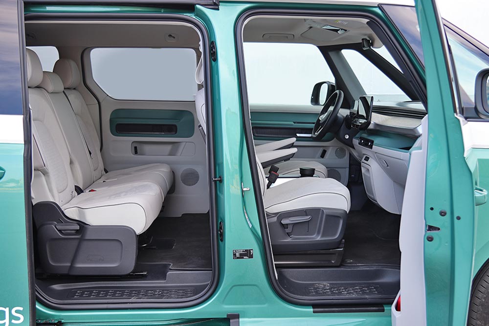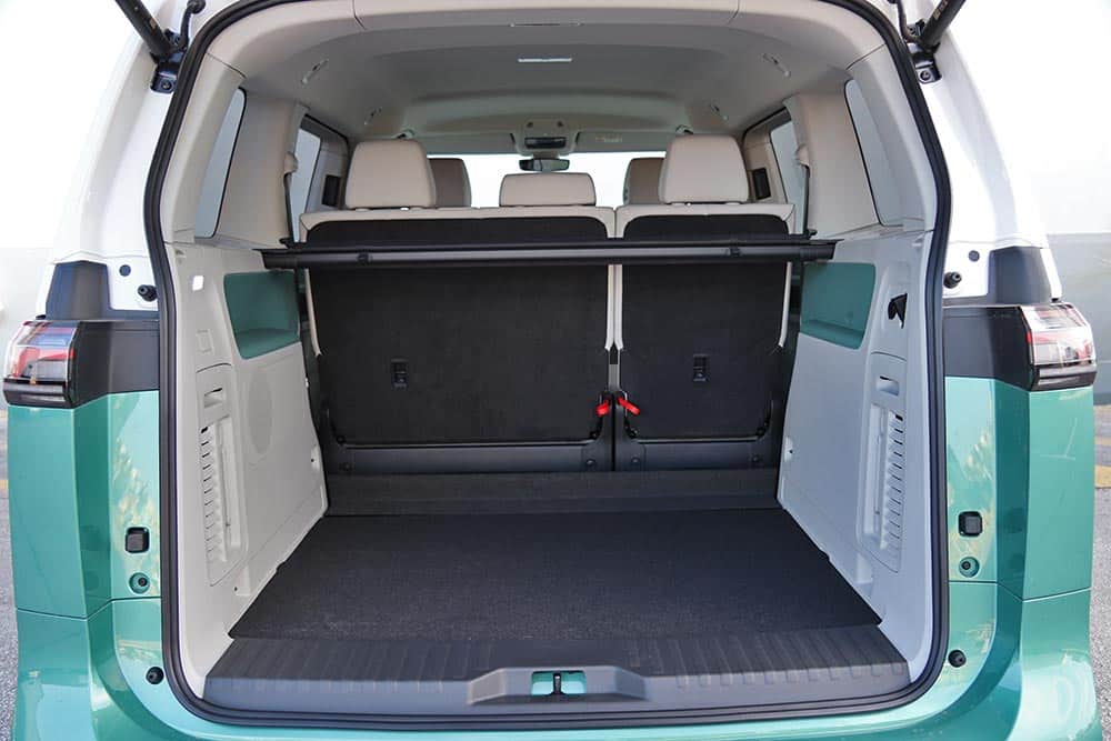 Εκεί όμως που το VW ID. Buzz δίνει ρέστα, είναι σε χώρους. Ο οδηγός και ο συνεπιβάτης κάθονται αρχοντικά, όπως και τρία ακόμα άτομα στο πίσω κάθισμα. Εκεί υπάρχει αφθονία σε πλάτος, ύψος και αέρα για τα πόδια, μαζί με την ευκολία του εντελώς επίπεδου δαπέδου. Την πρακτικότητα αυξάνει με τη σειρά του το πίσω συρόμενο κάθισμα κατά 150 χλστ., σε διάταξη 60:40. Οι ηλεκτρικά ανοιγόμενες πίσω συρόμενες πόρτες με το μεγάλο άνοιγμα διευκολύνουν πολύ την είσοδο και έξοδο από το όχημα. Τεράστιος είναι και ο χώρος αποσκευών των 1.121 λίτρων, που φτάνει τα 2.205 λίτρα με την αναδίπλωση των πίσω καθισμάτων.