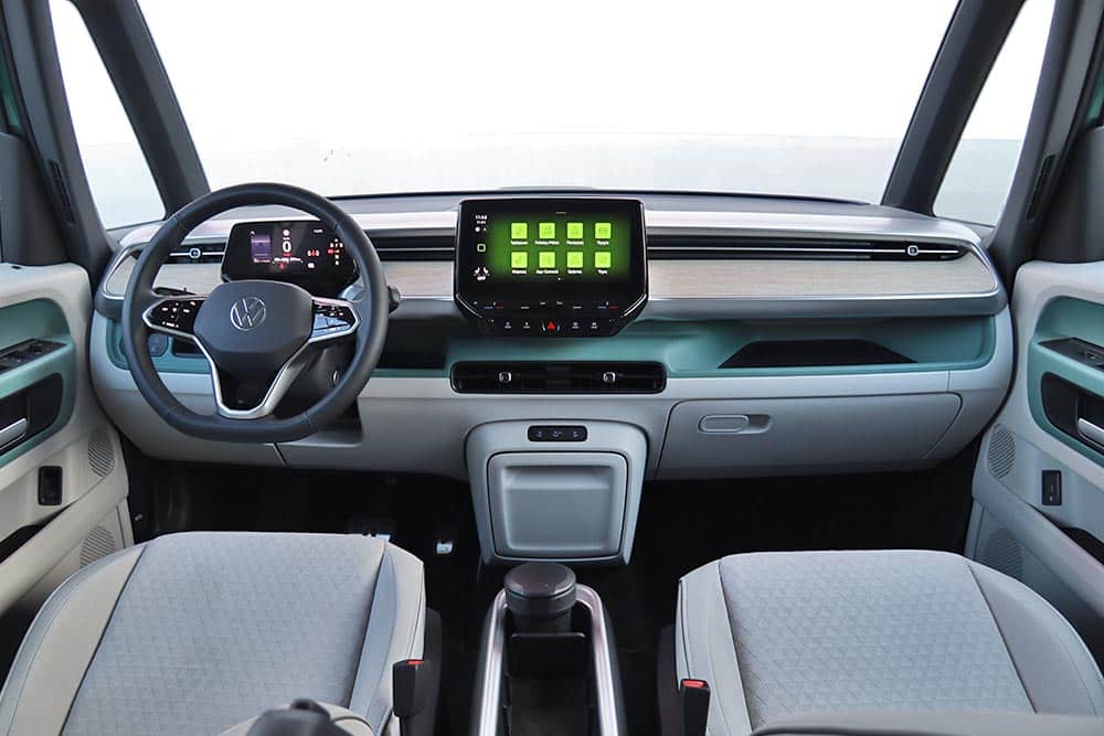 Η είσοδος στο εσωτερικό του VW ID. Buzz γίνεται πατώντας το σκαλοπάτι, αφού ο οδηγός και οι επιβάτες κάθονται πιο ψηλά από SUV. Τα υπερυψωμένα καθίσματα μαζί με το πολύ μεγάλο εμπρός παρμπρίζ και τα πλευρικά παράθυρα προσφέρουν άπλετη ορατότητα και φωτεινότητα, κάνοντας τις όποιες μετακινήσεις ευχάριστες και ξεκούραστες. Η σχεδίαση του ταμπλό είναι λιτή, με πολλές ευθείες γραμμές και επίπεδες επιφάνειες. Κατά τα γνωστά πρότυπα των άλλων μοντέλων ID., έτσι και το ID. Buzz διαθέτει ένα πολύ μικρό ψηφιακό πίνακα οργάνων με οθόνη 5,3 ιντσών και στο κέντρο του ταμπλό φιλοξενείται το σύστημα infotainment με οθόνη αφής 12 ιντσών. Ο χειρισμός γίνεται αποκλειστικά με χειριστήρια αφής, τα οποία δεν διευκολύνουν πάντα, γιατί ο οδηγός δεν έχει την αίσθηση του πατήματος, όπως γίνεται με τα τους παραδοσιακούς διακόπτες και μπορεί να χρειαστεί παραπάνω από ένα άγγιγμα στην οθόνη για την ενεργοποίηση κάποιας λειτουργίας. Από πλευράς κατασκευής, έχει γίνει ευρεία χρήση σκληρών πλαστικών σε κάθε επιφάνεια, κάτι που σίγουρα δεν είναι ότι καλύτερο για ένα αυτοκίνητο της τάξεως των σχεδόν 70.000 ευρώ. Τουλάχιστον η συναρμογή είναι αρκετά καλή, ενώ κάποιες επενδύσεις με όψη αλουμινίου και ξύλου βελτιώνουν το αποτέλεσμα.