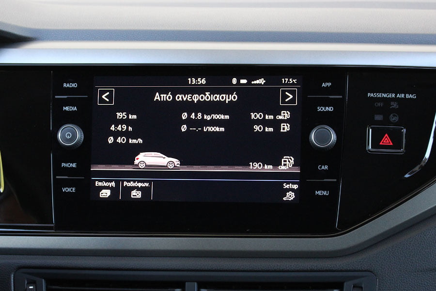 Οι αλλαγές που εντοπίζονται στο εσωτερικό του Polo 1.0 TGI εντοπίζονται μόνο στον πίνακα οργάνων. Στη θέση της θερμοκρασίας του κινητήρα έχει τοποθετηθεί η ένδειξη για την πληρότητα των δεξαμενών του φυσικού αερίου. Πρόσθετα, στην ψηφιακή οθόνη αναγράφονται και πληροφορίες για την κατανάλωση του CNG, την αυτονομία και την ποιότητα του καυσίμου. Στοιχεία που μπορεί να δει ο οδηγός μαζί με πάρα πολλές ακόμα πληροφορίες και εφαρμογές στην οθόνη αφής του συστήματος πολυμέσων.
