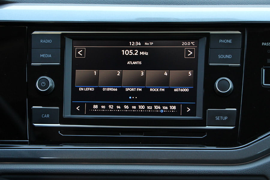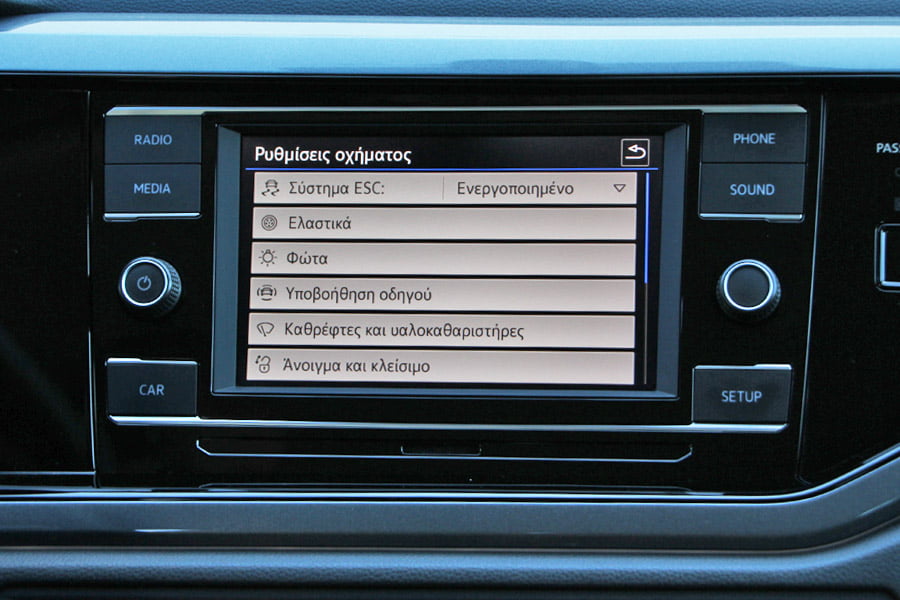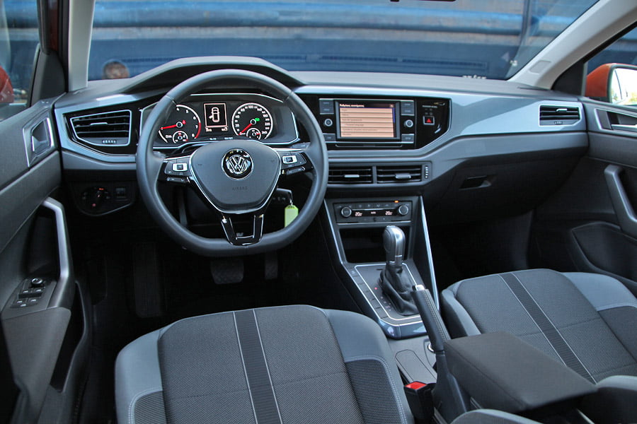 Από την πρώτη επαφή με την καμπίνα του VW Polo γίνεται αντιληπτή η πάρα πολύ καλή ποιότητα κατασκευής, η οποία είναι με διαφορά από τις ποιοτικότερες της κατηγορίας. Το εσωτερικό είναι αρκετά οδηγοκεντρικό, με το ταμπλό να είναι στραμμένο προς τον οδηγό και την ευκρινέστατη οθόνη αφής των 6,5 ιντσών να ξεχωρίζει. Ο πίνακας οργάνων είναι ευανάγνωστος και πλήρης ενδείξεων (προαιρετικά μπορεί να τοποθετηθεί ψηφιακός πίνακας οργάνων). Η θέση οδήγησης θα βολέψει τους πάντες, καθώς έχει αναπαυτικό κάθισμα με μεγάλο εύρος ρυθμίσεων, όπως και το τιμόνι (σε ύψος και απόσταση).