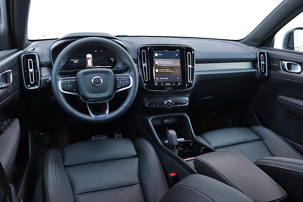 Στο θάλαμο των επιβατών του αμιγώς ηλεκτρικού XC40 δεν παρατηρείται καμία αλλαγή σε σχέση με τα συμβατικά μοντέλα, τόσο σε σχεδιασμό, όσο και σε ποιότητα. Όσον αφορά την κατασκευή του έχει δοθεί ιδιαίτερη προσοχή, τόσο χάρη στη χρήση μαλακών υλικών στα περισσότερα τμήματα της καμπίνας, όσο και στη στιβαρή συναρμογή και ενώσεις μεταξύ των επιμέρους τμημάτων. Ο χρήστης θα βρει εύκολα την κατάλληλη θέση και θα νιώσει αναπαυτικά στο κάθισμα. Χαρακτηριστικά γνωρίσματα αποτελούν οι δύο ψηφιακές οθόνες, των 12 ιντσών για τον πίνακα οργάνων και των 9 ιντσών του infotainment.