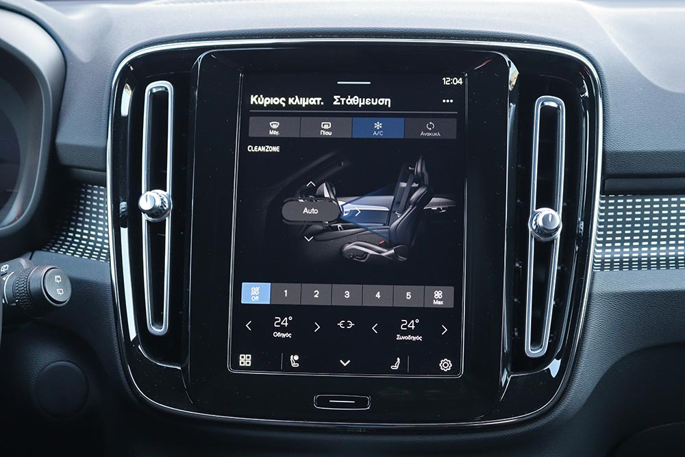 Οι χώροι των επιβατών του XC40 Recharge παρέμειναν αμετάβλητοι, που σημαίνει ότι οι δύο πίσω φιλοξενούμενοι έχουν αρκετό αέρα για το κεφάλι και τα πόδια τους. Το πορτ μπαγκάζ είναι λίγο μικρότερο στα 414 λίτρα (452 λτ. τα συμβατικά XC40), ωστόσο κάτω από το εμπρός καπό βρίσκεται ένας επιπλέον αποθηκευτικός χώρος 31 λίτρων για αντικείμενα όπως τα καλώδια φόρτισης ή ένα μικρό σάκο.