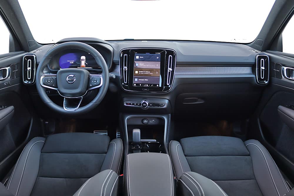 Ο θάλαμος των επιβατών του XC40 Recharge P6 είναι γνώριμος από τις υπόλοιπες εκδόσεις του, που σημαίνει ότι σε πρώτο πλάνο βρίσκεται η υψηλή ποιότητα κατασκευής. Μαλακά πλαστικά στο ταμπλό και στις πόρτες, επενδύσεις από συνθετικά υλικά, μαζί και η στιβαρή συναρμογή, απαρτίζουν ένα εσωτερικό που θα καλύψει και τους πιο απαιτητικούς. Για την απαραίτητη πλέον ψηφιοποίηση φροντίζουν ο ψηφιακός πίνακας οργάνων των 12 ιντσών και η κεντρική οθόνη των 9 ιντσών. Παράλληλα, οι ενσωματωμένες υπηρεσίες Google περιλαμβάνουν πολλές εφαρμογές, όπως είναι το Google Maps, το Google Assistant και το Google Play Store, ενώ λαμβάνονται ασύρματες ενημερώσεις (over-the-air) λογισμικού. Πολύ εξυπηρετικός είναι ο αισθητήρας βάρους στο κάθισμα του οδηγού, ο οποίος με το που κάθεται στη θέση του ενεργοποιούνται όλες οι λειτουργίες και έτσι δεν χρειάζεται να ψάχνει κουμπί εκκίνησης.