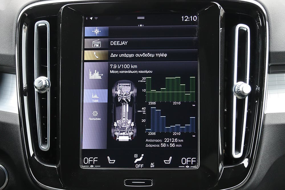 Με την μπαταρία πλήρως φορτισμένη να αναλαμβάνει την κίνηση του αυτοκινήτου στο μεγαλύτερο κομμάτι της οδήγησης σε αστικές συνθήκες, η μέση κατανάλωση μπορεί να πέσει κοντά στα 4 λτ./100 χλμ. Όταν αδειάσει και δεν γίνει φόρτιση, το κάνει ο κινητήρας, έχοντας παράλληλα και τον φόρτο της κίνησης του οχήματος. Τότε η κατανάλωση ανεβαίνει στα 6,9 λίτρα/100 χλμ., ωστόσο και πάλι παραμένει χαμηλή για ένα τέτοιο αυτοκίνητο. Εφόσον υπάρχει η δυνατότητα άμεσης φόρτισης, ο οδηγός του XC40 Recharge T5 μπορεί να καλύψει τις καθημερινές του διαδρομές με ελάχιστη χρήση βενζίνης.