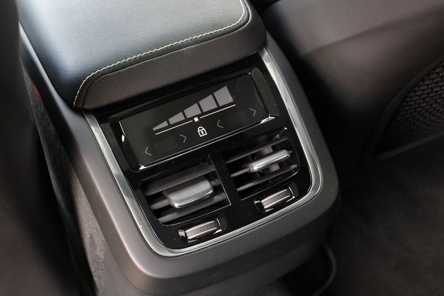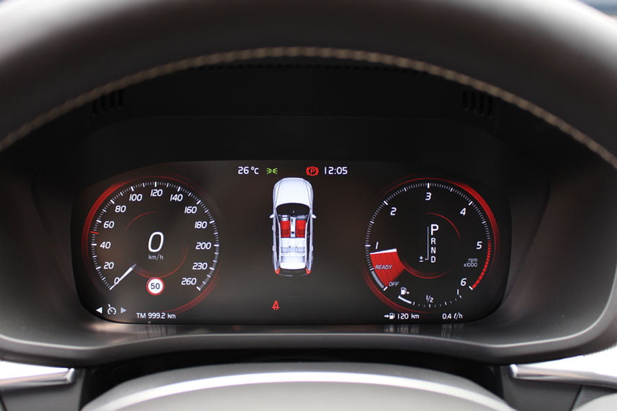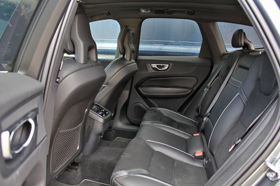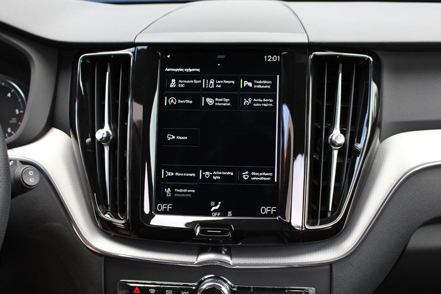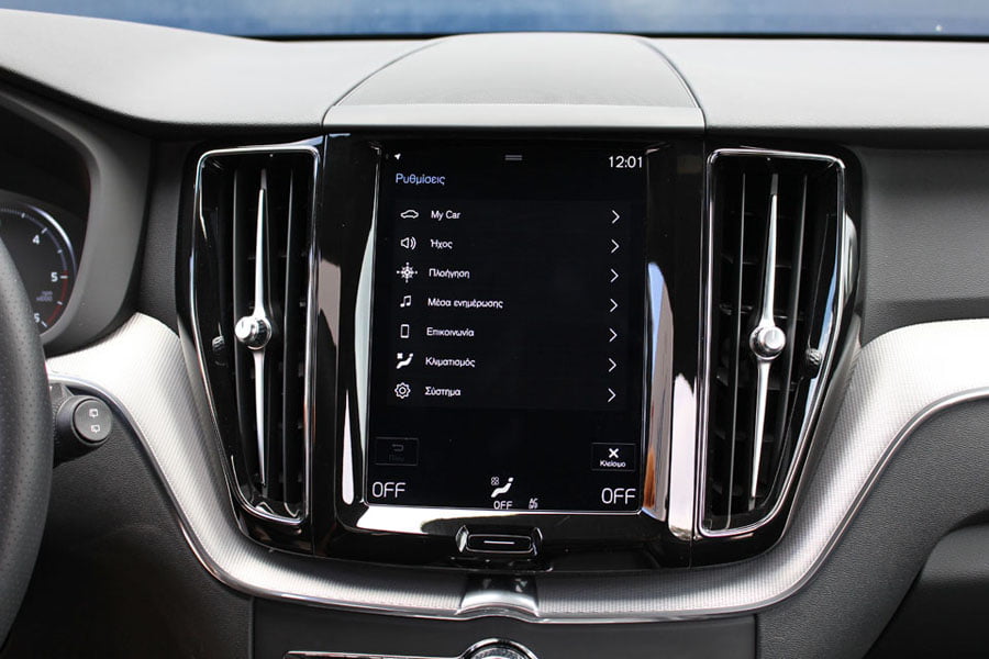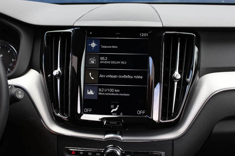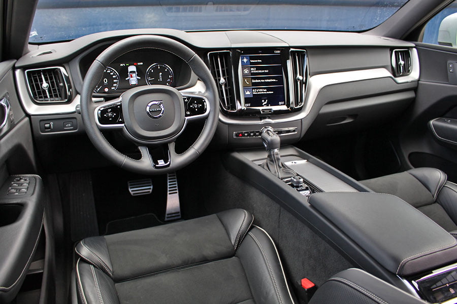 Στον θάλαμο των επιβατών του νέου Volvo XC60 κυριαρχεί η πολυτέλεια και η τεχνολογία. Βασικό στοιχείο αποτελεί η κάθετα τοποθετημένη κεντρική οθόνη αφής Sensus Connect των 9 ιντσών, όπου έχουν ενσωματωθεί πάρα πολλές λειτουργίες του αυτοκινήτου. Αρχικά ο οδηγός… πελαγώνει με το μενού της οθόνης μέχρι να μάθει που βρίσκεται το κάθε τι, ωστόσο μετά από λίγη ώρα μπορεί και χειρίζεται σχετικά εύκολα τα βασικά, αν και κάποια μπουτόν παραπάνω θα βελτίωναν την εργονομία. Την high-tech εικόνα ενισχύει και ο ψηφιακός πίνακας οργάνων των 12 ιντσών, ο οποίος αλλάζει γραφικά και παρέχει πληθώρα πληροφοριών. Από πλευράς κατασκευής έχει γίνει ευρεία χρήση μαλακών υλικών στο ταμπλό και στις πόρτες, η συναρμογή και το φινίρισμα είναι προσεγμένα, αλλά όχι κορυφαία για την κατηγορία των μεσαίων premium SUV. Κανένα παράπονο δεν θα υπάρξει από τους επιβάτες σε επίπεδο χώρων αφού είναι σε θέση να φιλοξενηθούν πέντε άτομα χωρίς να στριμωχτούν, ενώ μεγάλο, αλλά ρηχό είναι και το πορτμπαγκάζ των 505 λίτρων.