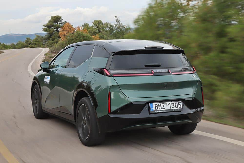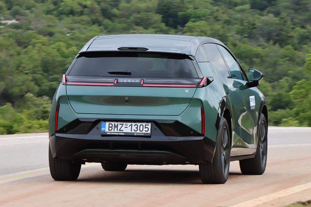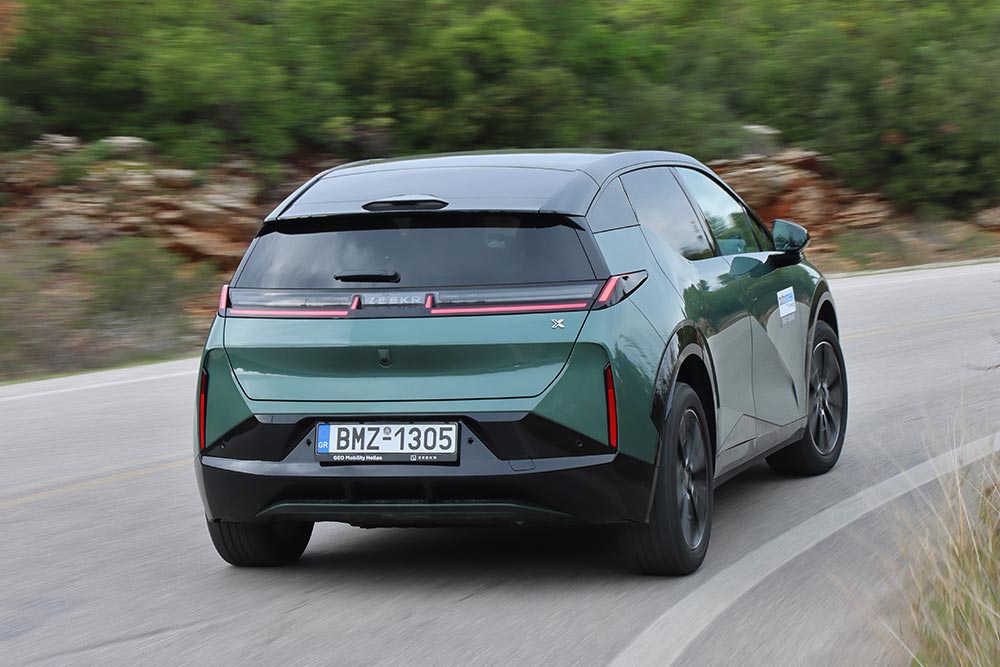 Στο δρόμο, το Zeekr X αποδεικνύεται ήσυχοστιβαρό και σταθερό στο ταξίδι. Η ανάρτηση είναι προφανές ότι έχει ρυθμιστεί με γνώμονα την άνεση, αλλά χωρίς να επιτρέπει στο αμάξωμα να «πλέει». Σε επαρχιακές διαδρομές με μέτριας ποιότητας άσφαλτο και αλλεπάλληλες στροφές, το Zeekr X δείχνει προβλέψιμο και καλοζυγισμένο. Το τιμόνι, χωρίς να είναι ιδιαίτερα πληροφοριακό, έχει το σωστό βάρος, ενώ η απόκριση στο γκάζι είναι άμεση, χωρίς εξάρσεις. Η πίσω κίνηση προσθέτει μια πιο φυσική αίσθηση στη συμπεριφορά, χωρίς όμως να μετατρέπει το αυτοκίνητο σε σπορ κατασκευή. Είναι ξεκάθαρα ρυθμισμένο για σταθερότητα, ασφάλεια και προβλέψιμες αντιδράσεις, στοιχεία που εκτιμώνται ιδιαίτερα στην καθημερινή χρήση αλλά και στα ταξίδια. Το Zeekr X είναι ένα ιδιαίτερα πολιτισμένο SUV που εμπνέει εμπιστοσύνη και σιγουριά, ακόμα και όταν ο δρόμος γλιστρά ή ο οδηγός υπερεκτιμήσει τις δυνατότητές του. Η ηχομόνωση είναι εξαιρετική και η κύλισή του στον αυτοκινητόδρομο αλλά και εκτός αυτού ποιοτική, παρά την ύπαρξη μικρών αεροδυναμικών θορύβων στις υψηλές ταχύτητες.