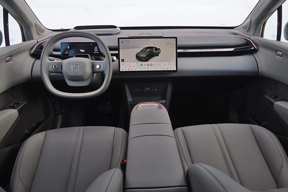 Το εσωτερικό κερδίζει τις εντυπώσεις με την πρώτη ματιά. Η σχεδίαση είναι μεν απλή, χωρίς περιττά στοιχεία, αλλά εξαιρετικά μοντέρνα και καθαρή. Η πάρα πολύ προσεγμένη ποιότητα κατασκευής με ευρεία χρήση μαλακών σε πολλές επιφάνειες, τις σουέτ επενδύσεις στις κολόνες και την οροφή, έως τα μπρονζέ διακοσμητικά, ενισχύουν την πολυτελή του εικόνα. Στο ταμπλό τις εντυπώσεις κλέβει η κεντρική οθόνη αφής των 14,6 ιντσών και μπροστά από τον οδηγό υπάρχει ένας ψηφιακός πίνακας οργάνων 8,8 ιντσών. Το «παρών» δίνει και ένα head-up display επαυξημένης πραγματικότητας 24,3 ιντσών, το οποίο προβάλλει πλήθος πληροφοριών στο παρμπρίζ, διευκολύνοντας την οδήγηση χωρίς να αποσπάται η προσοχή. Μέσα σε όλα έχουμε ήχους καλωσορίσματος – αποχώρησης, που κάνουν τα κεφάλια των περαστικών να γυρνάνε, ενδείξεις για τη φόρτιση της μπαταρίας κ.λπ. στην κολώνα της πόρτας και φωτορρυθμικό σόου όταν μπαίνεις στο αυτοκίνητο.