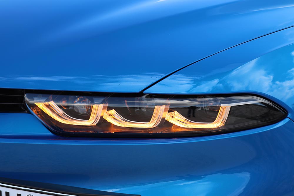 Το πρώτο μικρομεσαίο SUV της Alfa Romeo, η Tonale, δεν θα μπορούσε παρά να κεντρίζει τα βλέμματα και να γυρίζει κεφάλια. Ειδικά η μπλε απόχρωση «Misano Blu» της ταιριάζει τέλεια, αφού ενισχύει το δυναμισμό και την πολυτέλεια που αποπνέει, χωρίς όμως να γίνεται εκκεντρική. Το καλοσμιλεμένο αμάξωμα των 4.528 χλστ. μήκους είναι «τόσο όσο» χρειάζεται σπορτίφ, από όποια πλευρά και να την περιεργαστεί κανείς. Στο εμπρός επιθετικό άκρο κυριαρχεί η παραδοσιακή τριγωνική μάσκα, τα 3+3 full-LED φωτιστικά σώματα και οι μεγάλοι αεραγωγοί στον προφυλακτήρα. Στο πλάι το βλέμμα ακολουθεί το σφηνοειδές προφίλ και εστιάζει στις 20άρες ζάντες με το σχέδιο «telephone dial» και φόντο τις κόκκινες δαγκάνες της Brembo. Πίσω, ο σχεδιασμός των φώτων είναι συμμετρικός με των μπροστινών και ενώνονται με μια φωτεινή κόκκινη λωρίδα που τονίζει το πλάτος.