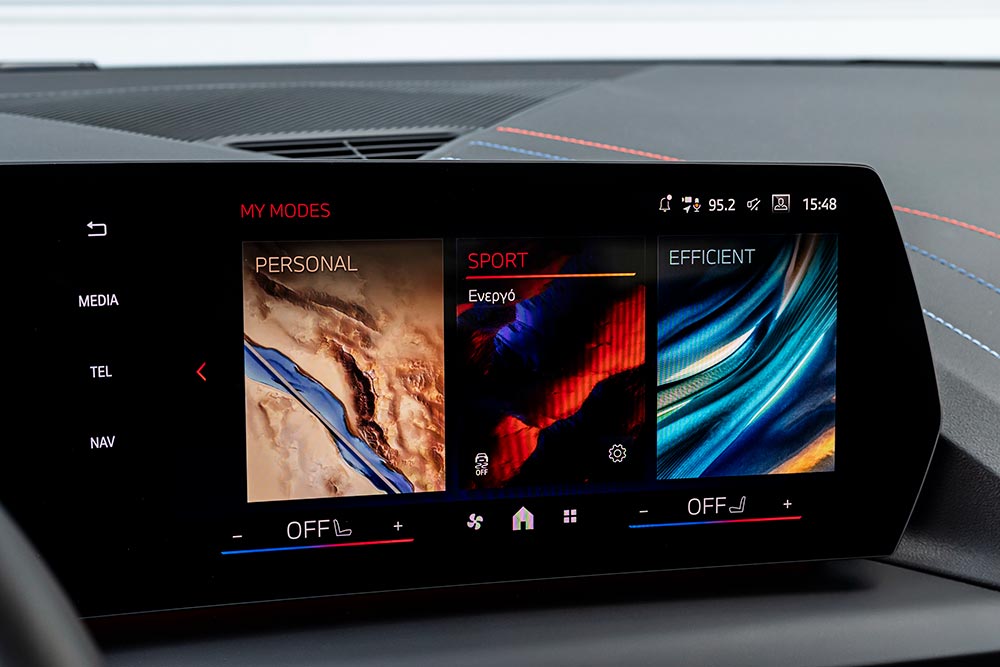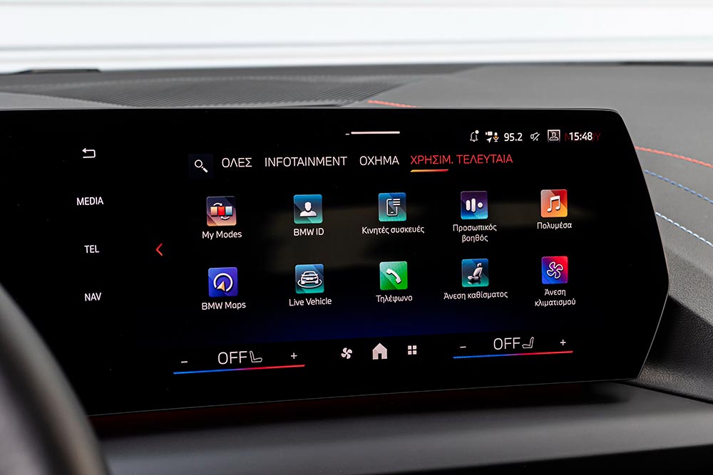 Εισχωρώντας στο εσωτερικό της BMW 120 δεν αντικρίζεις τίποτα που να θυμίζει το προηγούμενο μοντέλο. Νέα σχεδιαστικά πρότυπα και τεχνολογίες έχουν υιοθετεί στο έπακρο από τη γερμανική φίρμα συνδυάζοντας πολυτέλεια, εργονομία, ποιότητα, παρά το γεγονός ότι είναι το εισαγωγικό μοντέλο στην γκάμα της εταιρείας. Την παράσταση κλέβει η… συνήθης πλέον δίδυμη αλλά ενιαία κυρτή οθόνη BMW Curved Display που αποτελείται από μια οθόνη πληροφοριών 10,25 ιντσών (πίνακας οργάνων) και το infotainment 10,7 ιντσών. Το σαφές, εύχρηστο και γρήγορο λειτουργικό σύστημα εφοδιάζεται με την τελευταία έκδοση του BMW OS 9 επιτρέποντας στο χρήστη να διαμορφώσει το δικό του προφίλ με προσωπικές προτιμήσεις (συντομεύσεις και widgets), ενώ μέσω του ConnectedDrive Store μπορεί να κατεβάσει ψηφιακές υπηρεσίες με συνδρομή. Δεν χρειάζεται να αναφέρουμε ότι οι γνωστές και πλέον απαραίτητες ευκολίες συνδεσιμότητας με smartphones μέσω Apple CarPlay και Android Auto είναι παρούσες και φυσικά ασύρματα. Ο διακόπτης του επιλογέα ταχυτήτων, όπως και το πάνελ στη βάση της κονσόλας είναι επανασχεδιασμένα με ενσωματωμένα τα haptic κουμπιά για διάφορες λειτουργίες όπως τα προφίλ οδήγησης, τις κάμερες, τις συντομεύσεις κτλ.