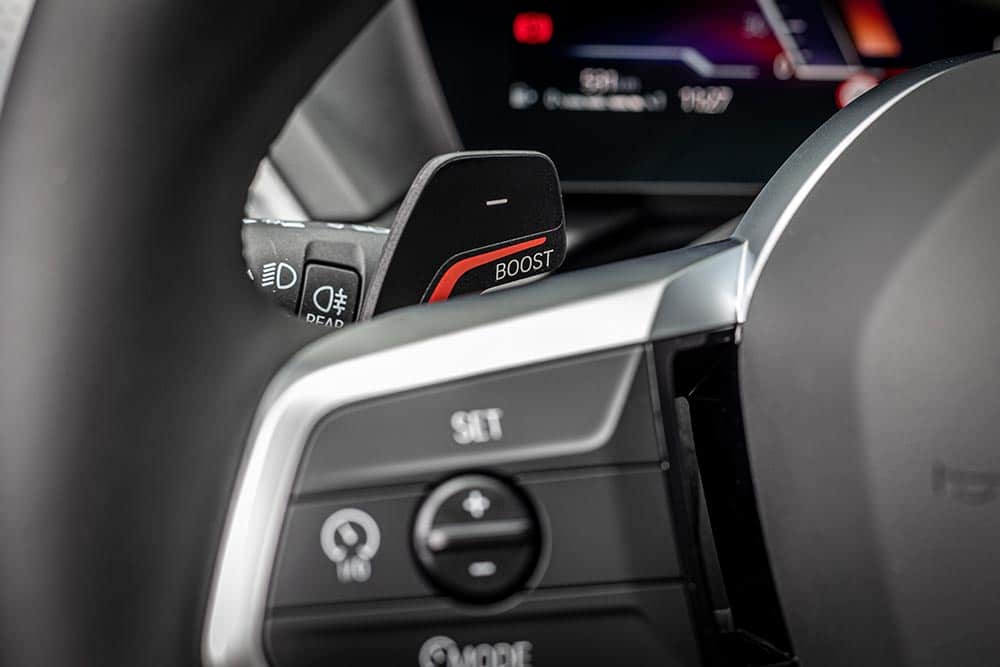 Ό,τι παράπονο έχεις από τους χώρους, έρχεται να τα αντισταθμίσει το δίδυμο κινητήρα-μετάδοσης. Ο τρικύλινδρος υπερτροφοδοτούμενος βενζινοκινητήρας των 1.5 λίτρων αποδίδει 156 ίππους και 240 Nm, συνεπικουρούμενος από ένα μικρό ηλεκτρομοτέρ 20 ίππων και 55 Nm. Συνολικά, ο οδηγός έχει στο δεξί του πόδι 170 άλογα και 280 Nm, απολαμβάνοντας δυνατό τράβηγμα από τις μόλις 1.400-1.500 σ.α.λ. Γιατί ακόμα και να αργήσει να σπουλάρει η τουρμπίνα, ο ηλεκτροκινητήρας δίνει το απαραίτητο boost στις χαμηλές στροφές. Μιλώντας για boost, τραβώντας τα paddles πίσω από το τιμόνι για λίγα δευτερόλεπτα, ενεργοποιείς το Sport Mode χωρίς να το ψάχνεις από το διακόπτη στην κεντρική κονσόλα. Λειτουργία που λόγω κιβωτίου, χρειάζεται συχνά.