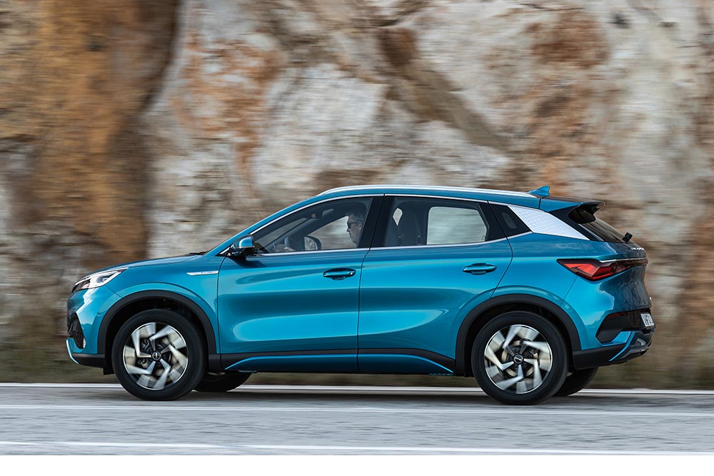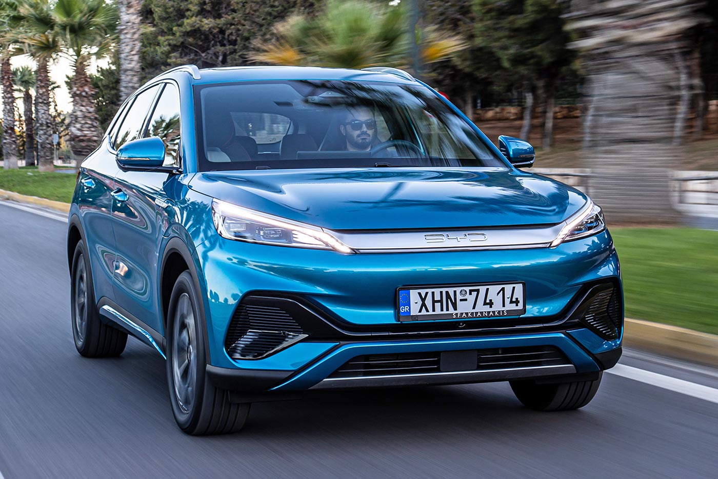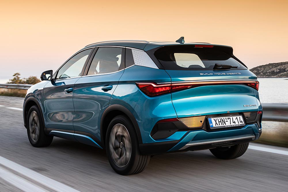 To μάτι «συλλαμβάνει» με τη μία τις γραμμές του ATTO 3 (εκ του αττοδευτερολέπτου, τη μικρότερη μονάδα μέτρησης στη Φυσική, που υποδηλώνει τον δυναμισμό, την ενέργεια και την ταχύτητα του αυτοκινήτου), οι οποίες το φέρνουν στο επίκεντρο των σύγχρονων ηλεκτρικών στάνταρ. Κλειστή μάσκα, επιθετική διαμόρφωση προφυλακτήρα, ενιαία φωτιστικά σώματα εμπρός-πίσω (τα εμπρός όχι ακριβώς, ενώνονται με μια λωρίδα), φαντεζί σόου με τα LED όταν κλειδώνεις/ξεκλειδώνεις, όμορφες ζάντες, ακόμα πιο όμορφο χρώμα (ό,τι καλύτερο στην παλέτα το Surfing Blue). Δεν γίνεται να ζητήσεις κάτι παραπάνω από τις αναλογίες του ATTO 3, που καταφέρνει να διατηρείται και σε σχετικά συμπαγές επίπεδο από πλευράς διαστάσεων. Το μήκος δεν ξεπερνά τα 4.455 χλστ., με το πλάτος στα 1.870 χλστ., το ύψος στα 1.615 χλστ. και το μεταξόνιο στα 2.720 χλστ., τοποθετώντας το C-SUV της BYD στη «χρυσή τομή» των χώρων και της ευελιξίας (σημαντικός σύμμαχος και τα 10,7 μέτρα του κύκλου στροφής).