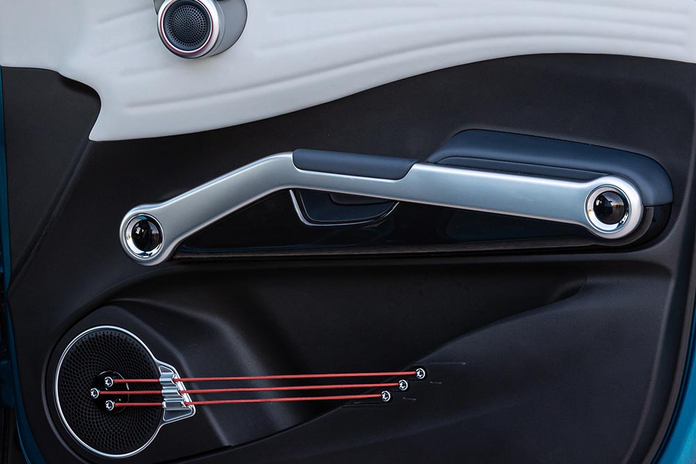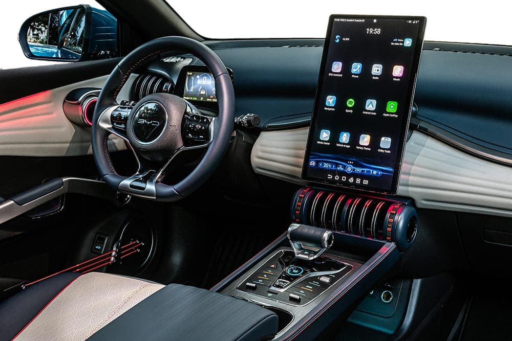 Η πολύ ευχάριστη έκπληξη έρχεται όταν ανοίγεις την πόρτα και αντικρίζεις ένα ταμπλό, που όμοιό του δεν βρίσκεις ούτε σε supercar! Κύματα παντού, τόσο στις επενδύσεις όσο και την ίδια, τη μορφή του, με μια τεράστια στάνταρ οθόνη αφής 12,8 ιντσών (15,6 ιντσών στην έκδοση Design) στο κέντρο να αναλαμβάνει τη διαχείριση του infotainment και μια μικρή 5 ιντσών πίσω από το τιμόνι, να θυμίζει μοτοσικλέτας. Όπου κι αν κοιτάξεις, βρίσκεις λεπτομέρειες: στο σπιράλ σχήμα των αεραγωγών που θυμίζουν βραχιόλια, τις γραμμές των faux δερμάτινων επενδύσεων, τον «αεροπορικό» επιλογέα του κιβωτίου, τις χειρολαβές τις πόρτας, τις χορδές που συνθέτουν τις θήκες στις πόρτες. Ειδικά οι τελευταίες αποτελούν highlight, παράγοντας νότες που θυμίζουν το παραδοσιακό κινεζικό όργανο γκου τσιν (gu qin) και ταιριάζοντας ιδανικά με τους αντίστοιχους ήχους καλωσορίσματος-αποχαιρετισμού, όταν ενεργοποιείς-απενεργοποιείς τον κινητήρα.