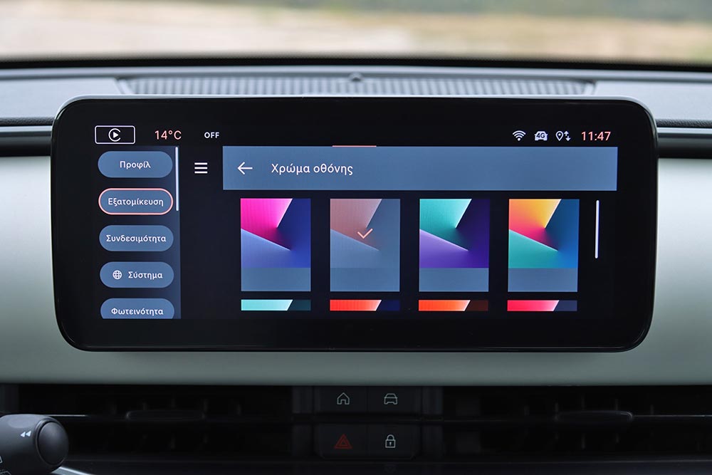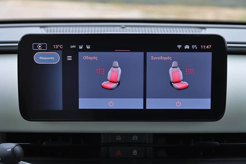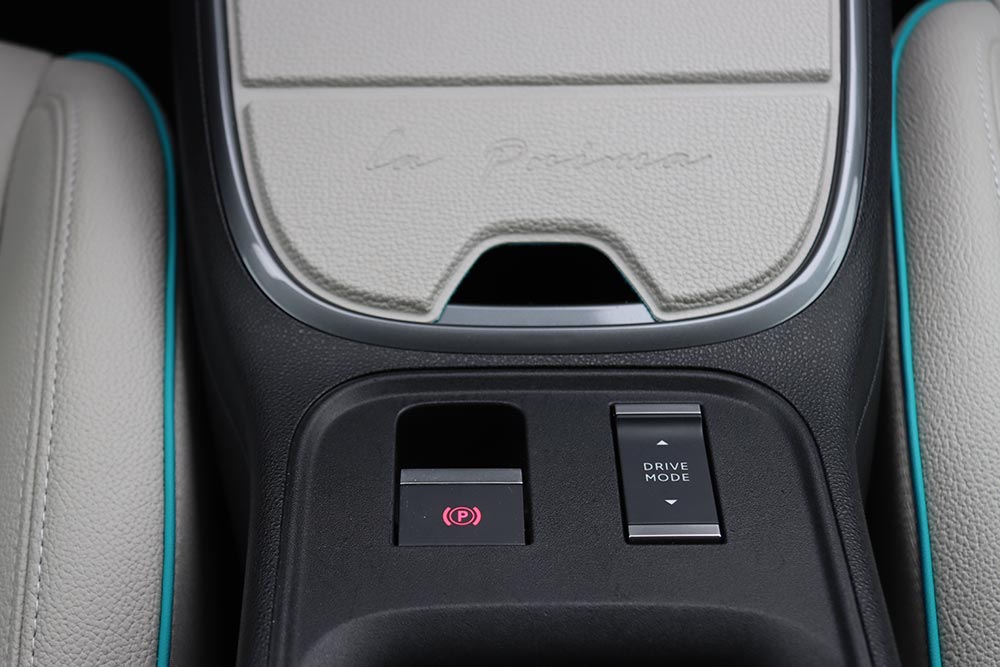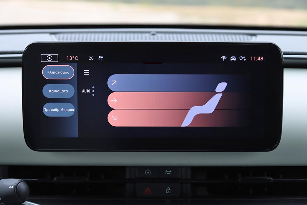 Η θέση οδήγησης είναι αναπαυτική, ρυθμίζεται ηλεκτρικά σε όλες τις κατευθύνσεις, διαθέτει μασάζ, (έκδοση La Prima) ενώ το τιμόνι θα «βρει τη θέση του» χάρη στο ρυθμιζόμενο ύψος και βάθος. Συναντάμε πληθώρα φυσικών διακοπτών για τις βασικές λειτουργίες και έτσι δεν χρειάζεται να ψάχνουμε σε μενού και υπομενού για τα στοιχειώδη. Ο παραδοσιακός λεβιές ταχυτήτων έχει δώσει τη θέση του σε μια αρκετά βαθιά και χρηστική θήκη, η οποία κλείνει με μαγνητικό καπάκι, όπως είναι στα tablets, έχοντας την επιλογή και της μερικής κάλυψης, για την τοποθέτηση π.χ. ενός ψηλού θερμός. Το δε ντουλαπάκι μπροστά στο συνοδηγό είναι «απύθμενο»! Το αυτόματο κιβώτιο μονής σχέσης λειτουργεί μέσω μιας τετράδας κουμπιών (P, R, N, D/Β) ενώ λίγο πιο πίσω υπάρχει το κουμπί για το ηλεκτρικό χειρόφρενο και το αντίστοιχο για τα 3 προφίλ οδήγησης Eco, Normal και Sport. Θήκες για μικροαντικείμενα θα μπορούσαν να υπάρχουν περισσότερες, ειδικά για τους πίσω, όπου δεν υπάρχει καμία στις πόρτες.