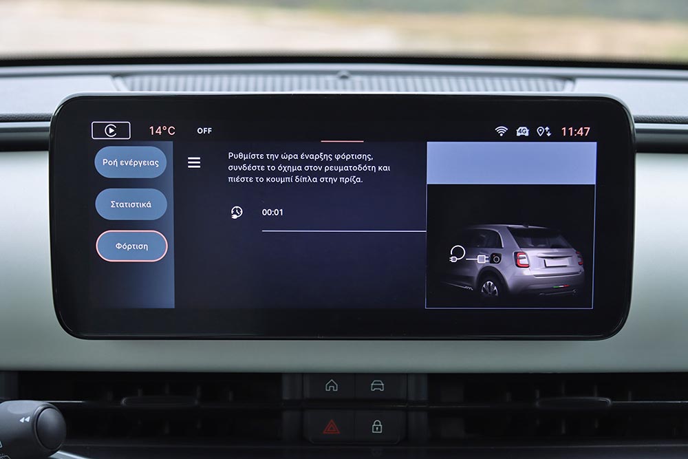 Η γνώριμη εικόνα του μικρού αδερφού 500e συνεχίζεται και στο εσωτερικό του 600e, όπου οι ικανοποιητικοί χώροι, τα εργονομικά χαρακτηριστικά και οι καμπύλες σου φτιάχνουν τη διάθεση. Στο κέντρο συναντάμε το infotainment με οθόνη 10,25 ιντσών που περιλαμβάνει όλες τις απαραίτητες για την εποχή μας λειτουργίες, όπως την ασύρματη σύνδεση των κινητών τηλεφώνων με λειτουργικό iOS και Android, επιτρέποντας ασφαλέστερη χρήση κατά την οδήγηση. Το σύστημα πολυμέσων U-Connect 5 εκτός των άλλων προσφέρει επίσης ασύρματη λειτουργία Mirroring με δύο συσκευές κινητών, αλλά και συμβατότητα με δίκτυα 5G. Ο παραμετροποιήσιμος πίνακας οργάνων είναι τεχνολογίας TFT με διάσταση 7 ίντσες.