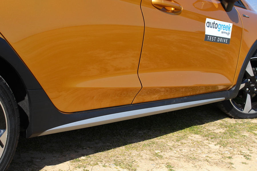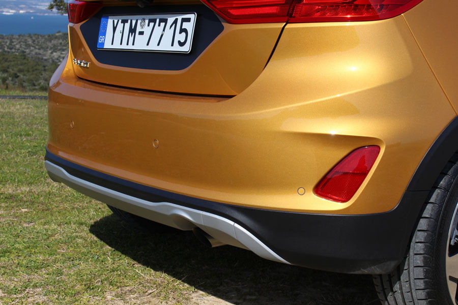 Το Active διαχωρίζει την θέση του από τα υπόλοιπα Fiesta μονομιάς, απόρροια των προστατευτικών περιμετρικά του αμαξώματος και των μεγάλων τροχών. Η αυξημένη απόσταση από το έδαφος κατά 18 χλστ. δεν φαίνεται τόσο, όσο η διχρωμία που προκαλούν τα πλαστικά και οι ράγες οροφής με το χρώμα. Ειδικά όταν το τελευταίο είναι το μπρονζέ των φωτογραφιών, που κατά την γνώμη μας είναι ο ιδανικότερος χρωματισμός για το μικρότερο crossover στην γκάμα της Ford.