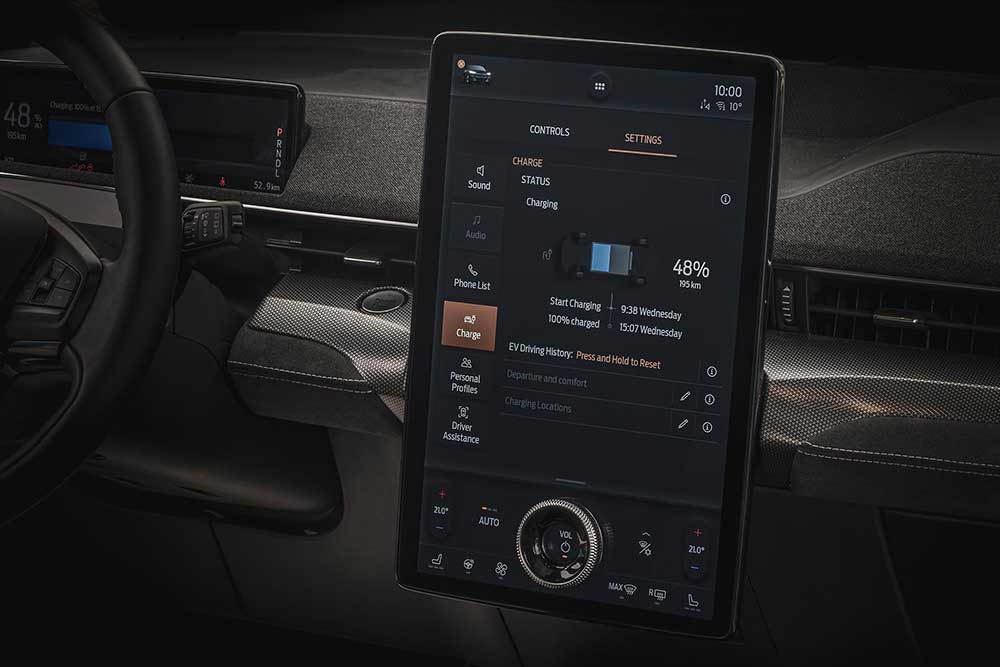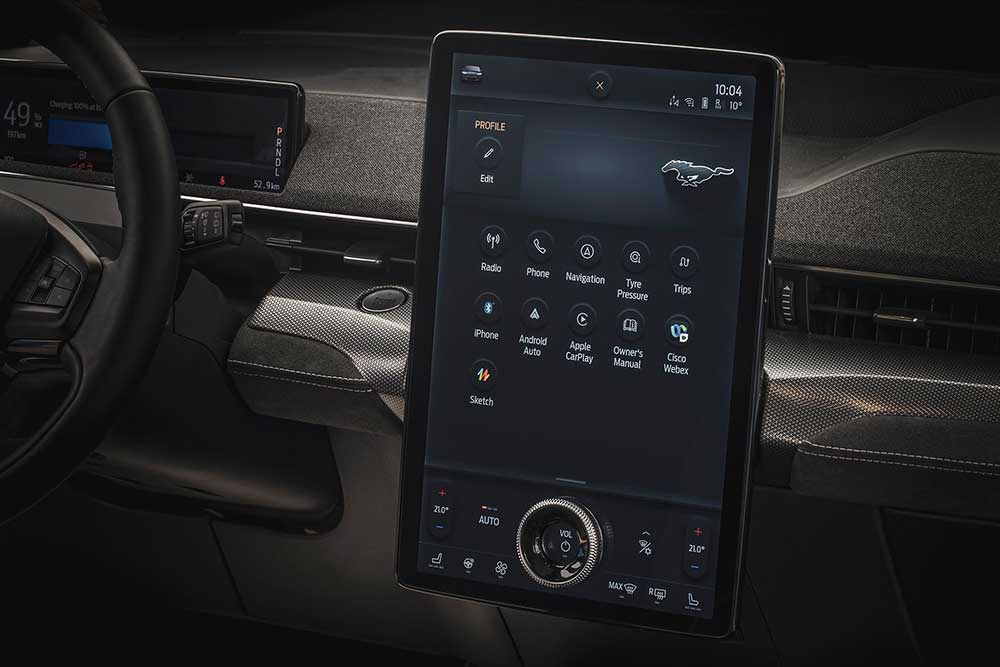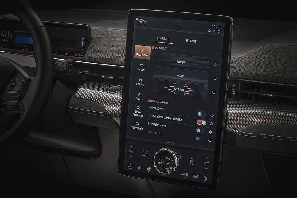 Τα -επίσης ειδικά εξελιγμένα για τη Mach-E GT- Pirelli, διάστασης 245/45/R20, φροντίζουν για την αδιάλειπτη παροχή πρόσφυσης, αλλά όχι σε αποπνικτικό βαθμό. Η κατανομή της ροπής διατηρεί δραστήρια την ουρά, βοηθώντας σε να βγαίνεις «ίσιος» από τις στροφές ή απλά να προσφέρεις θέαμα. Υποστροφή θα εμφανιστεί στιγμιαία και μόνο σε κλειστές στροφές, μέχρι να αλλάξει το «ματσάρισμα» της ισχύος εμπρός-πίσω. Ο οδηγός έχει στη διάθεσή του 3+1 προγράμματα λειτουργίας (Whisper, Active, Untamed και Untamed Plus), που αλλάζουν το ποσοστό παροχής συνολικά και μεταξύ των δυο αξόνων. Στο Whisper, ας πούμε, η Mustang είναι κατά βάση μπροστοκίνητη, την ώρα που με το Untamed («αδάμαστο») ξεκλειδώνει το 90% της δυναμικής.