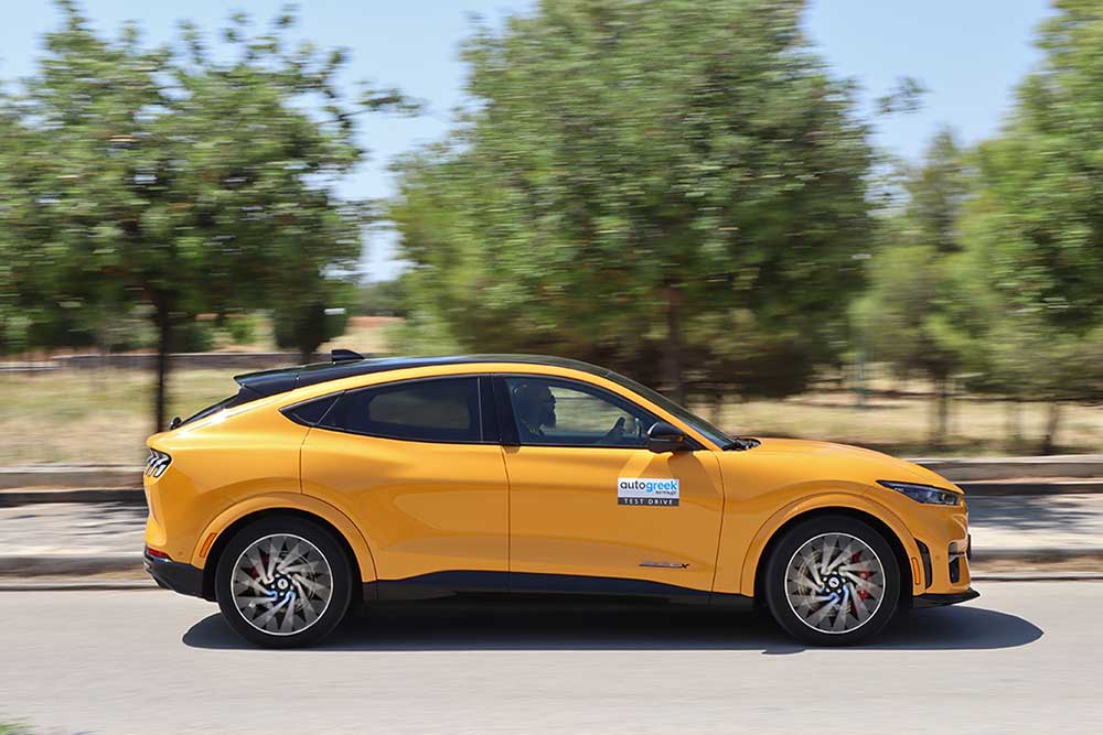 Ακόμα και κάποιος που δεν έχει την παραμικρή ενασχόληση με τα αυτοκίνητα, καταλαβαίνει πως το αυτοκίνητο δεν αστειεύεται. H GT ξεχωρίζει άμεσα από τις υπόλοιπες Mach-E χάρις στις νέες ζάντες των 20 ιντσών, που κρύβουν δισκόφρενα της Brembo 385 χλστ. μπροστά και 316 χλστ. πίσω (με δαγκάνες σε Colorado Red απόχρωση),το μαύρο χρώμα των αεροδυναμικών προσθηκών (στις «εισαγωγές» του προφυλακτήρα, στο splitter, τις ποδιές και τον διαχύτη), τη μαύρη Dark Matter Grey μάσκα και το Cyber Orange χρώμα (τριπλή στρώση βαφής, 1.860 ευρώ κόστος) του αμαξώματος, που χαρίζει μια λαμπερή παρουσία στην κορυφαία ηλεκτρική Mustang.