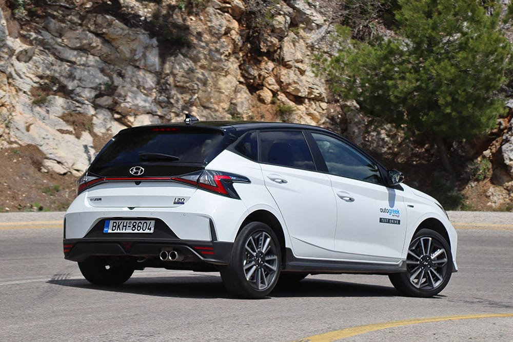 Η σφιχτότερη και χαμηλότερη ανάρτηση επιφέρει ένα τίμημα στην άνεση, όμως μειώνει ακόμα περισσότερο τις κλίσεις και εντείνει την αμεσότητα τόσο του εμπρός, όσο και του πίσω μέρους. Οι τεχνικοί της Hyundai αξίζουν συγχαρητήρια για τη ρύθμιση του ESP, το οποίο επιτρέπει ελαφριά γωνία στην ουρά ακόμα και ενεργοποιημένο. Το 215άρι πέλμα των ελαστικών δεν προβληματίζεται από την ισχύ του κινητήρα, συνεπώς σπανιότατα και σχεδόν αποκλειστικά σε άσφαλτο-«σαπούνι» θα χρειαστεί να ασχοληθείς με υποστροφή. Υπερστροφή, αντίθετα, μπορείς να προκαλέσεις κατά βούληση, μέχρι ενός (ελεγχόμενου από τα ηλεκτρονικά) σημείου. Βοηθά σε αυτό και το βαρύτερο, πιο γρήγορο τιμόνι, που έρχεται πιο κοντά στην αίσθηση του i20 N.