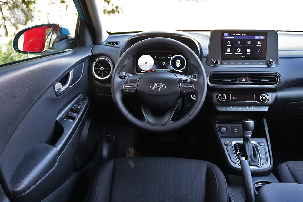Η προσοχή της Hyundai στράφηκε στην καμπίνα των επιβατών. Η βασική γραμμή του ταμπλό παρέμεινε ως είχε, όπως και τα πλαστικά που είναι σκληρά μα με εξαιρετική συναρμολόγηση και καλό φινίρισμα. Εκεί που το Kona κάνει «raise» είναι στη high tech αύρα. Ο νέος ψηφιακός πίνακας οργάνων των 10,25 ιντσών συνοδεύεται από μεγαλύτερη οθόνη αφής 8 ιντσών (από 7) στην κορυφή του ταμπλό, αναβαθμίζοντας σημαντικά την τεχνολογική απόχρωση του εσωτερικού. Στο ίδιο μήκος κύματος το σύστημα πολυμέσων, με τις λειτουργίες Android Auto και Apple CarPlay.