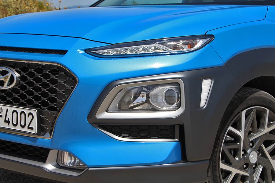 Εξωτερικά, δεν πρόκειται να μπερδέψεις το Kona με κανένα άλλο αυτοκίνητο. Τα λεπτά LED ημέρας «σχιστά» LED ημέρας, η μεγάλη μάσκα και τα πλαστικά προστατευτικά γύρω-γύρω συνθέτουν μια μοναδική παρουσία για το κορεατικό crossover. Οι διαφορές μεταξύ του Hybrid και των υπολοίπων περιορίζονται στα ανάλογα σήματα και το περίτεχνο σχέδιο των ζαντών, τουλάχιστον για τις 18άρες. Από πλευράς διαστάσεων δεν διαφοροποιείται σε σχέση με τα υπόλοιπα Kona και έχει μήκος 4.165 χλστ., πλάτος 1.800 χλστ., ύψος 1.565 χλστ. και μεταξόνιο 2.600 χλστ.