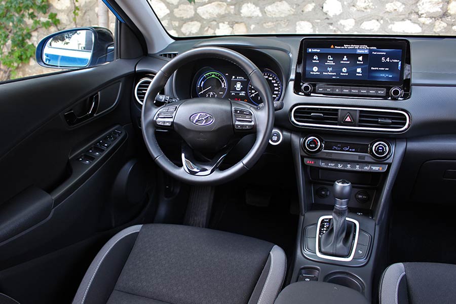 Στο εσωτερικό, οι διαφορές μεταξύ του υβριδικού και των «άλλων» Kona είναι ακόμα λιγότερες. Η οθόνη στον πίνακα οργάνων απεικονίζει τον τρόπο λειτουργίας του υβριδικού συστήματος και η μεγάλη, των 10,25 ιντσών, στο κέντρο του ταμπλό εμφανίζει γραφικά με την κατανάλωση τόσο της βενζίνης, όσο και του ρεύματος. Από εκεί και πέρα, η εικόνα είναι γνώριμη.