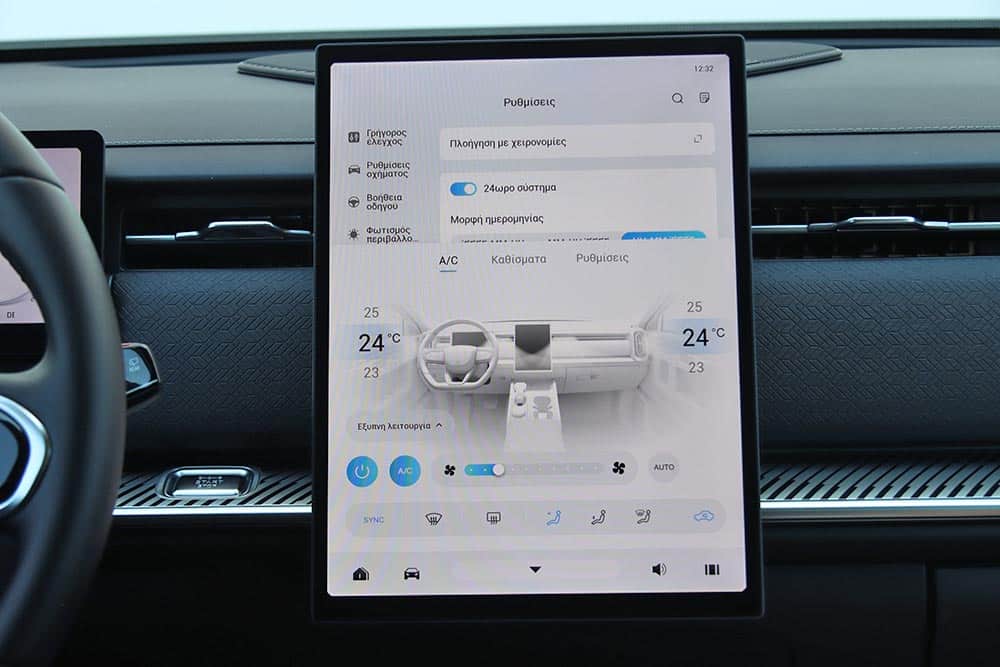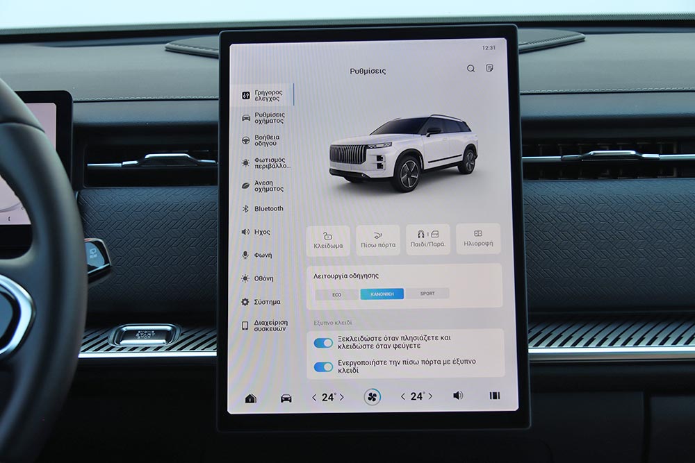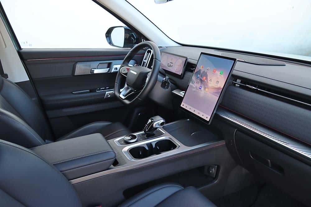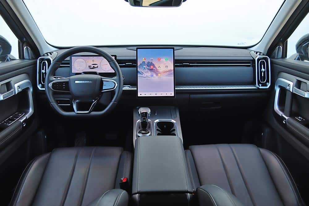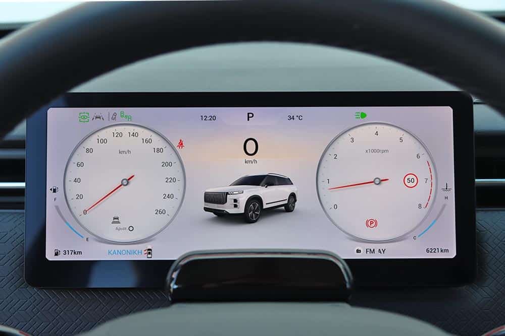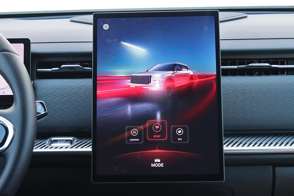 Στο εσωτερικό του Jaecoo 7 ακολουθείται ένα σχεδιαστικό μοτίβο στο ταμπλό που συναντάται πολύ σε αρκετά καινούργια αυτοκίνητα. Μια οθόνη για τον πίνακα οργάνων (10,25 ιντσών), άλλη μία κάθετη στο κέντρο του infotainment (13,2 ιντσών ή 14,8 ιντσών στο πιο πλούσιο Exclusive), ευθείες γραμμές και ελάχιστα φυσικά χειριστήρια. Γεγονός που αυτομάτως σημαίνει ότι όλες οι λειτουργίες ελέγχονται από την κεντρική οθόνη με το μενού που απαιτεί λίγα λεπτά εκμάθησης έτσι ώστε ο οδηγός να βρίσκει εύκολα τις βασικές λειτουργίες. Ο επιλογέας του αυτόματου κιβωτίου που παραπέμπει σε μοχλό αεροσκάφους κυριαρχεί στη βάση της κεντρικής κονσόλας, όπου παράλληλα βρίσκονται το περιστροφικό χειριστήριο του Drive Mode, κάποιοι διακόπτες, ποτηροθήκες και δύο θέσεις ασύρματης φόρτισης smartphone. Στις πόρτες τα ασημί διακοσμητικά με τις βίδες θέλουν να δώσουν μια «off road» πινελιά, αλλά τελικά είναι μάλλον παράταιρα με το πολυτελές ύφος που θέλει να προβάλλει το αυτοκίνητο. Από πλευράς ποιότητας τα μαλακά υλικά που έχουν χρησιμοποιηθεί σε πολλές επιφάνειες είναι καλά, όπως επίσης το φινίρισμα και η συναρμογή.